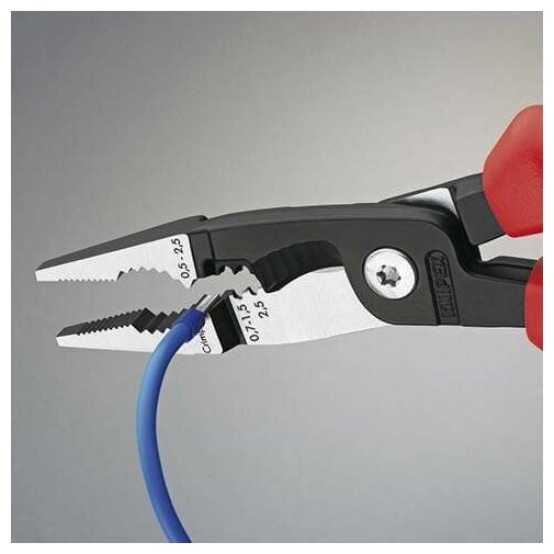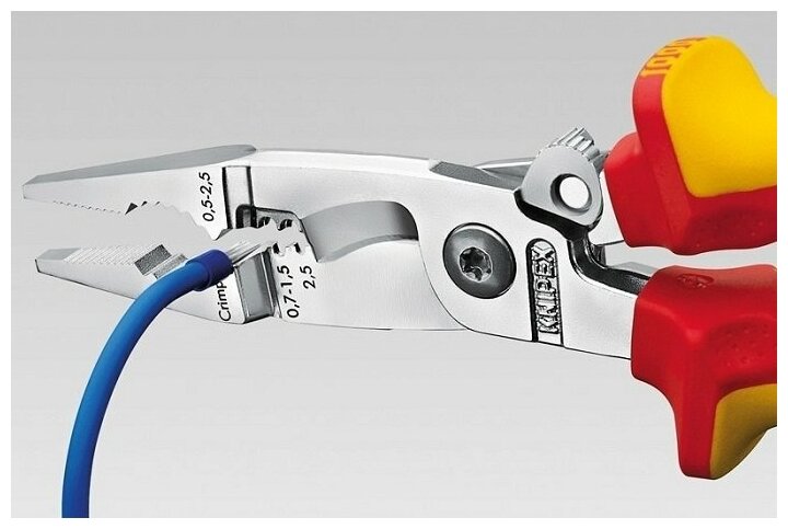 Mногофункциональные клещи для электромонтажных работ. Отверстия для удаления изоляции с проводов 0,75 - 1,5 мм2 и 2,5 мм2; Опрессовочное гнездо для контактных гильз 0,5 – 2,5 мм2. Специальная инструментальная сталь особого качества, кованая, закалённая в масле.