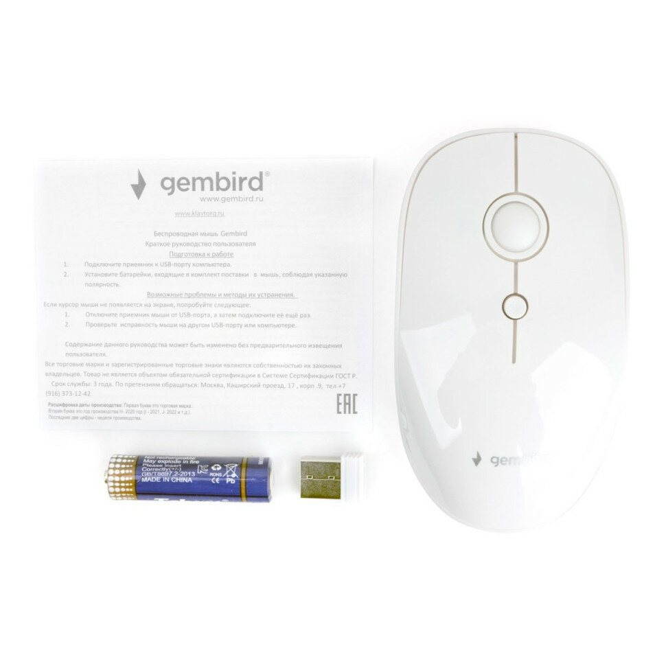 Gembird представляет собой беспроводную мышь с оптическим сенсором и возможностью смены разрешения кнопкой на спинке. Подключение к ПК производится посредством ресивера USB, передача сигнала от мышки к ресиверу осуществляется на частоте 2.4 ГГц.