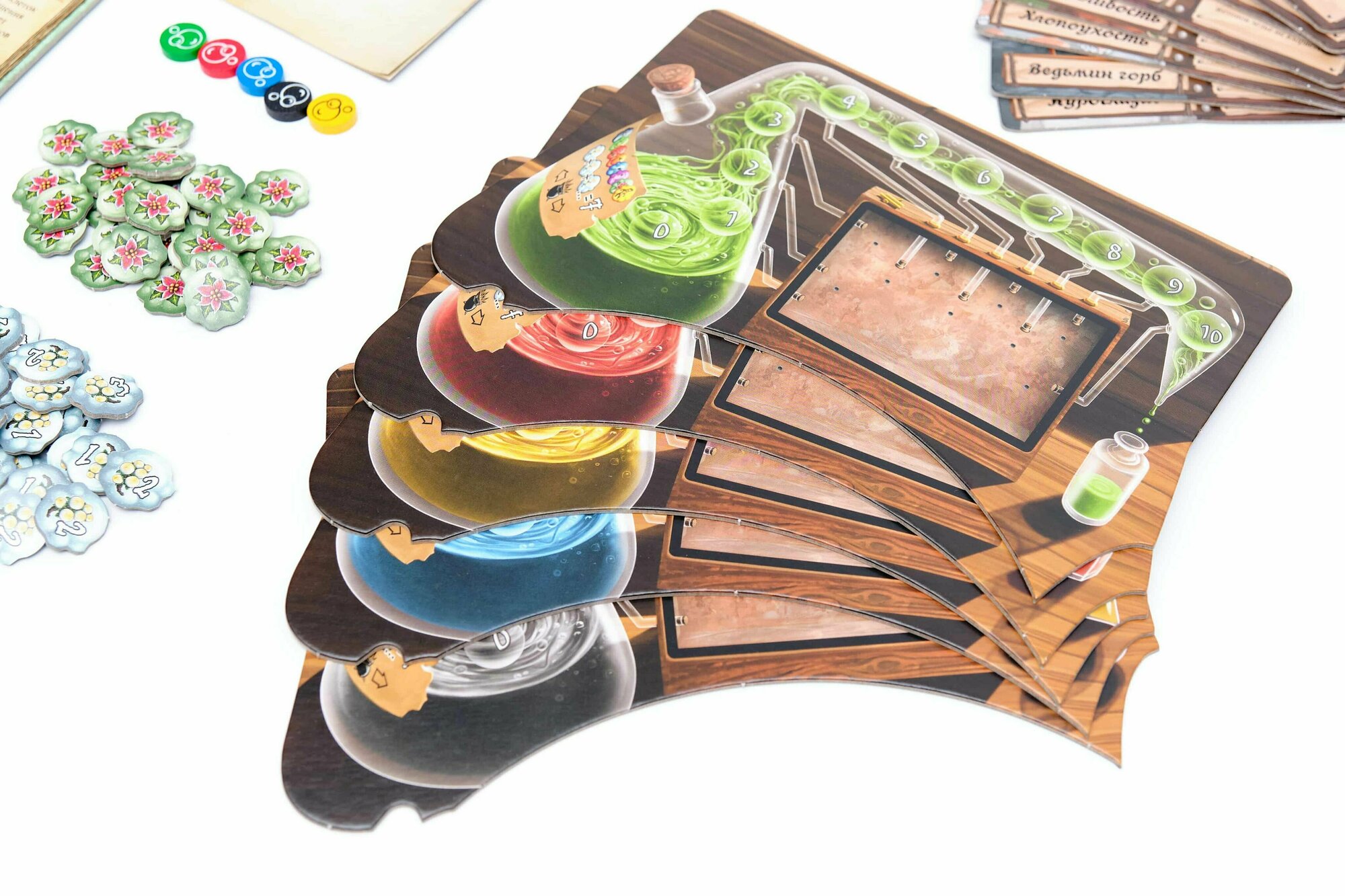 | Комплектация | 5 колб алхимиков; 5 фишек эссенций; 8 карточек пациентов; 8 жетонов пациентов; 2 двусторонние книги рецептов; 20 карт предсказаний; 20 карт эссенций; 30 жетонов дурмана; 40 запасных белых жетонов (25 ценностью 1, 10 ценностью 2, 5 ценностью 3); правила игры. |