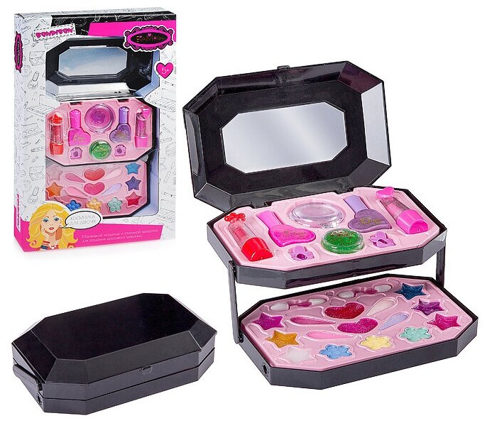 В наборе: косметичка, 2х-уровневая, раскладная с зеркальцем: блеск для губ 10 оттенков (7 г), тени для век 7 оттенков (4,7 г), лак для ногтей 2 оттенка (15,6 г), помада 2 оттенка (2,4 г), 2 заколки, гель-блеск (3,9 г), 2 аппликатора.
