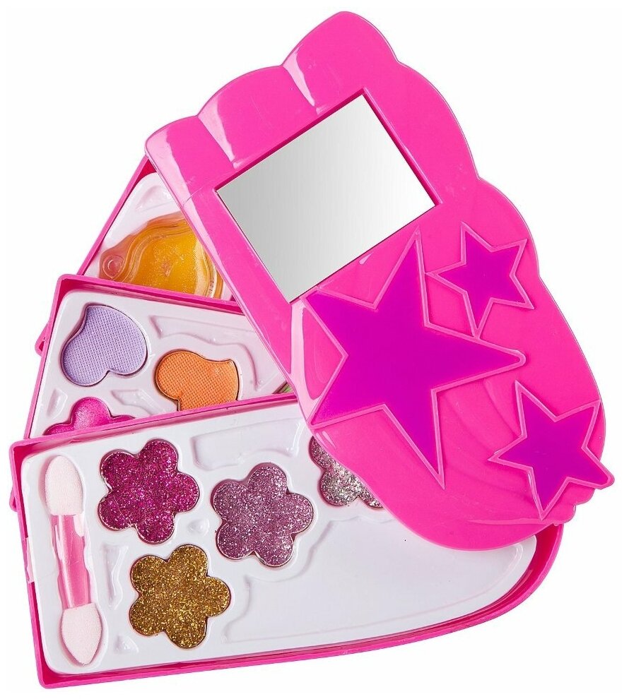 В наборе: косметичка-телефон, 3х-уровневая, раздвижная, с зеркальцем: тени для век с блёстками 4 оттенка (2,4 г), тени для век 5 оттенков (3,5 г), 2 аппликатора, лак для ногтей (7,8 г), помада (0,8 г), блеск для губ (1 г).