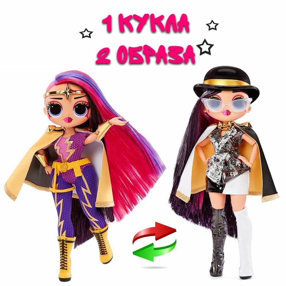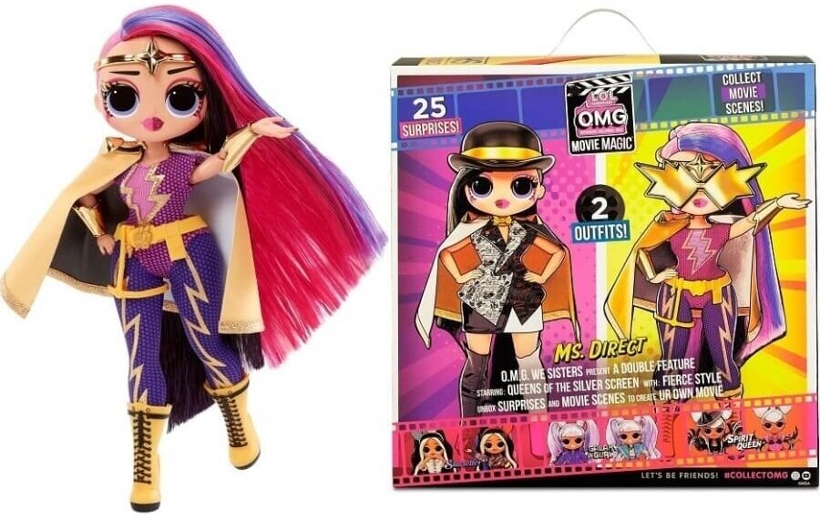 - Кукла LOL OMG Movie Doll Ms.Direct выглядит, как кинозвезда! И как любая актриса, меняет образы. Её стильные наряды выполнены в супергеройской тематике, а яркая прическа идеально завершает образ.