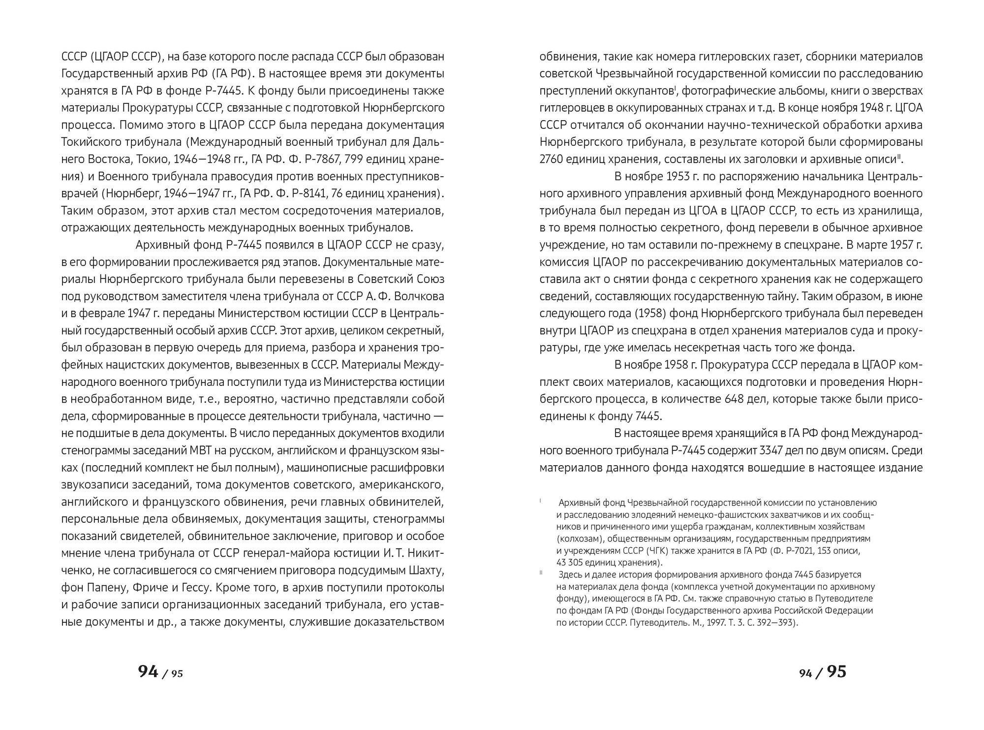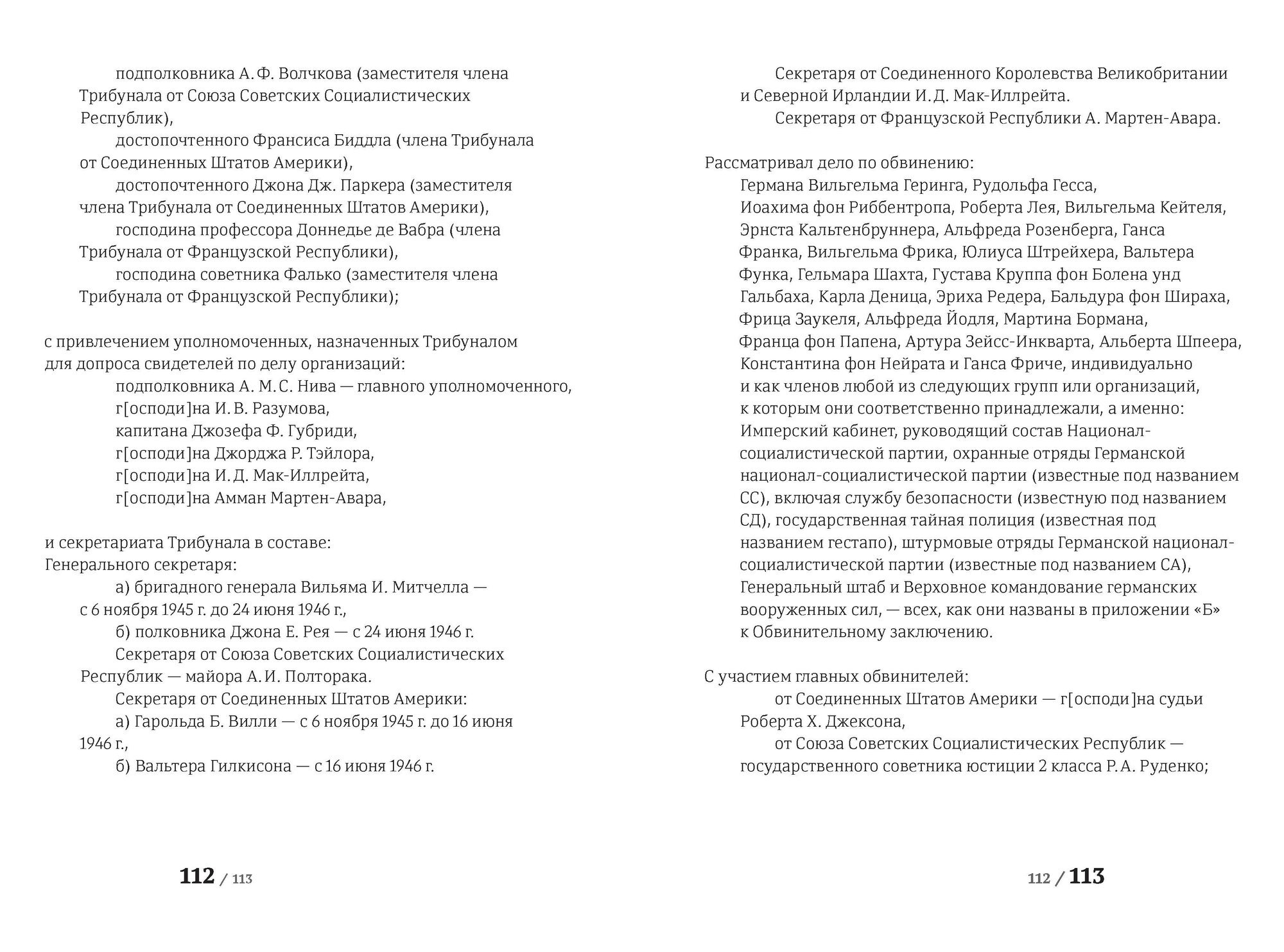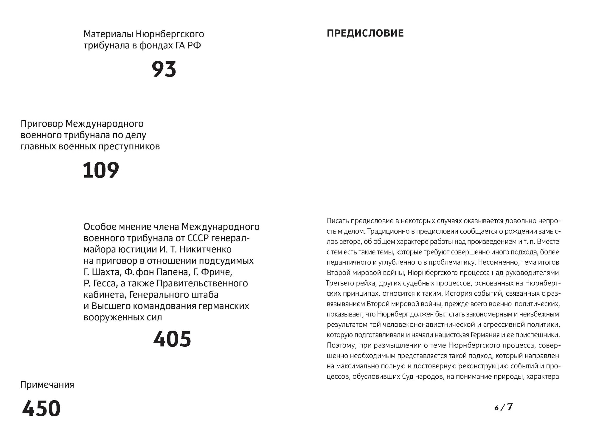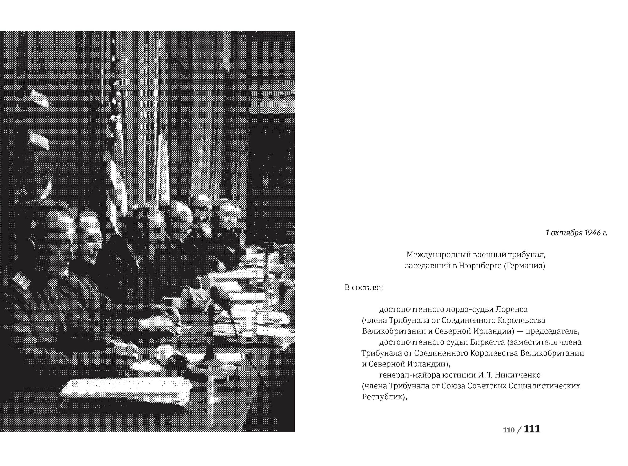 Впервые на русском языке полностью публикуются два значительных как по исторической важности, так и по объему документа, хранящиеся в Государственном архиве Российской Федерации. Приговор Международного военного трибунала над нацистскими преступниками в Нюрнберге и Особое мнение члена Международного военного трибунала от СССР генерал-майора юстиции И. Т. Никитченко по приговору, вынесенному Трибуналом в отношении подсудимых, а также преступных организаций: правительственного кабинета, генерального штаба и высшего командования Германских вооруженных сил печатается по подлинному экземпляру на русском языке.