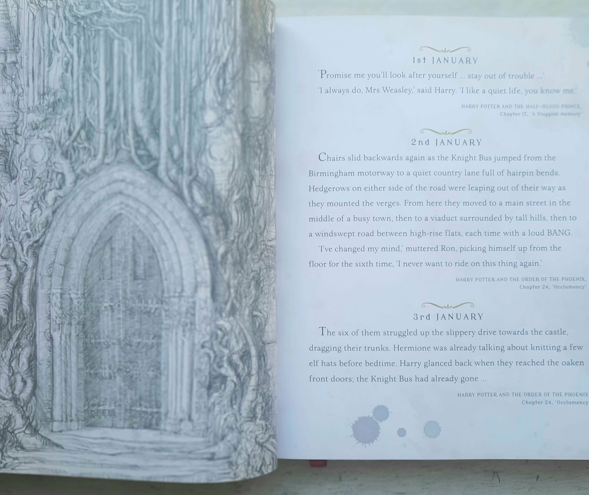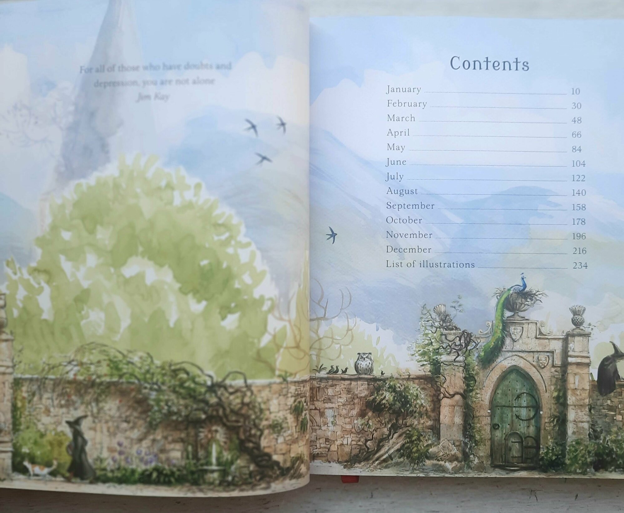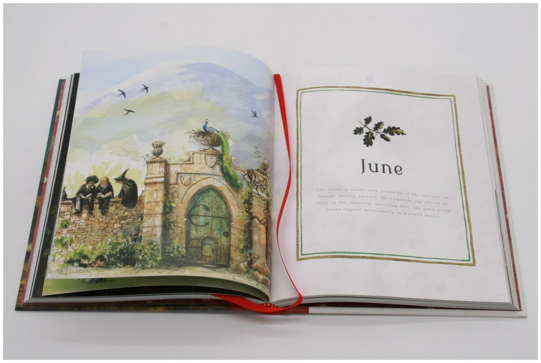 В “A Magical Year” собраны цитаты из всей саги о Гарри Поттере на каждый день года. Цитаты по антуражу соответствуют месяцам, в которых они представлены, в книге также указаны дни рождения любимых героев. Плюс разнообразие иллюстраций: где простой карандашный набросок, где буйство цвета и красок. В общем, художник Джим Кей показал еще раз создал мир моей любимой книжной серии — магических существ и любимые места, знакомых героев и сказочную атмосферу.