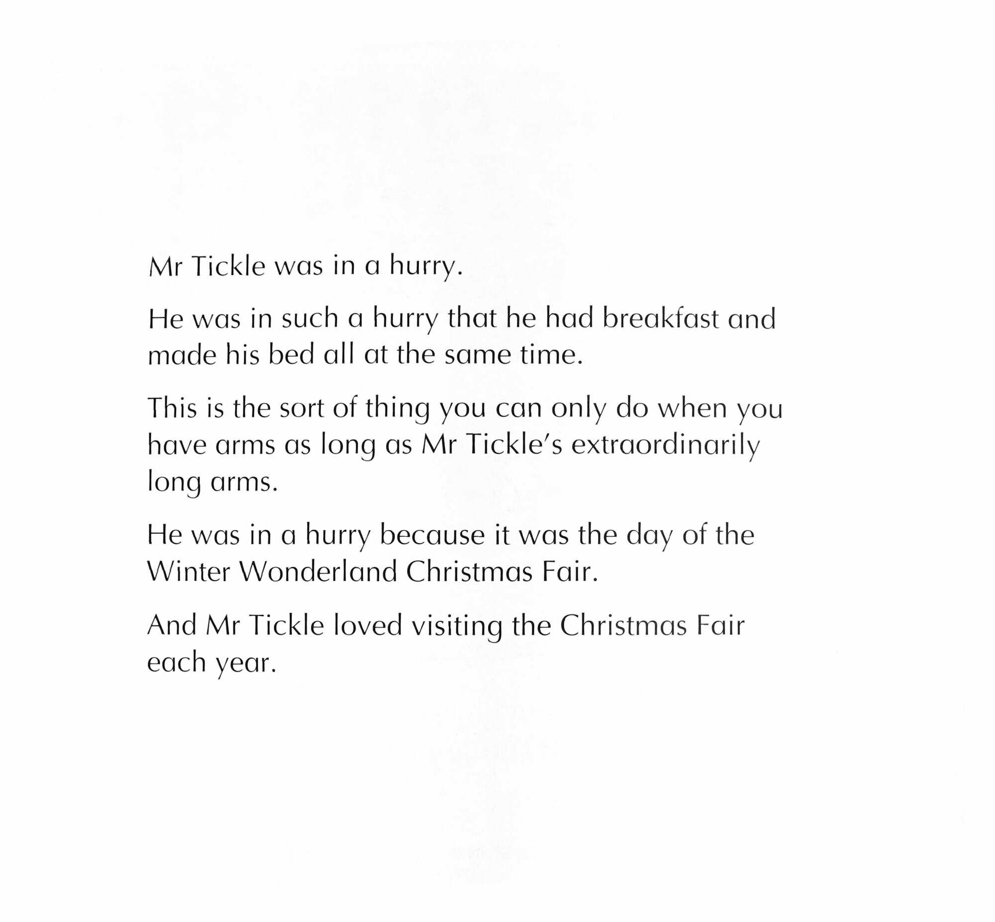 Mr Tickle can't wait to visit the Winter Wonderland Christmas Fair. There will be plenty of treats, ice skating and sleigh rides. But most of all Mr Tickle can't wait to visit the crowds and tickle as many people as his arms can reach!