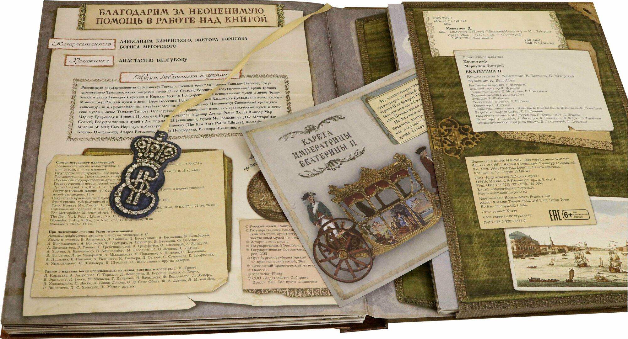 Две мои любимые трогательные детали. Закладка с драгоценным вензелем и карета императрицы, которую можно собрать из картона. Я вот купила книжку немножко на вырост, и жду когда ребенок оценит (и книгу, и карету с платьями). Но есть в этом что-то очень человеческое. И Екатерина II становится немного понятнее.