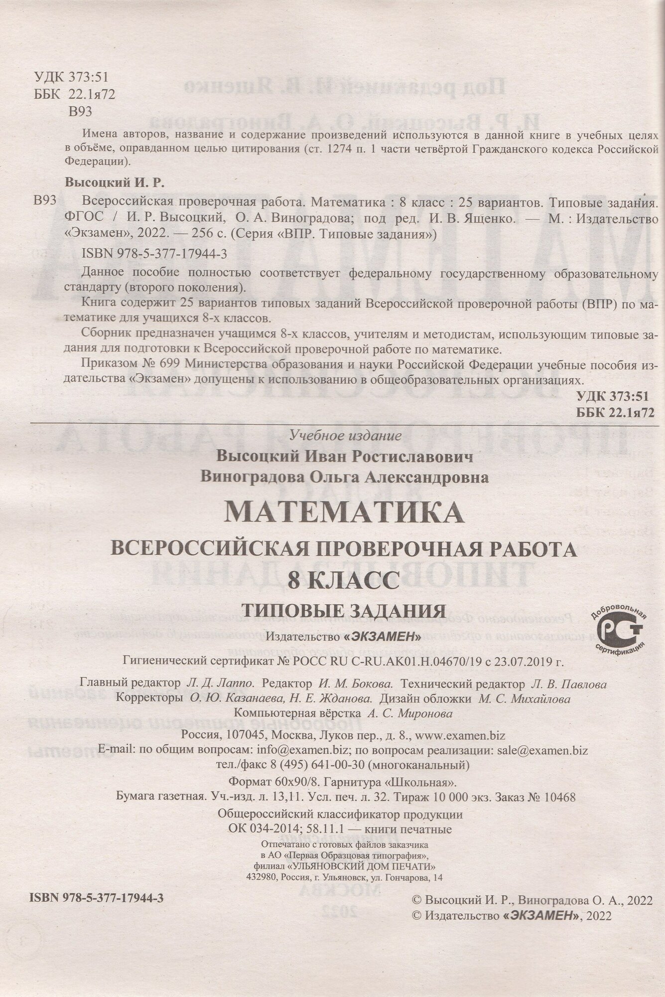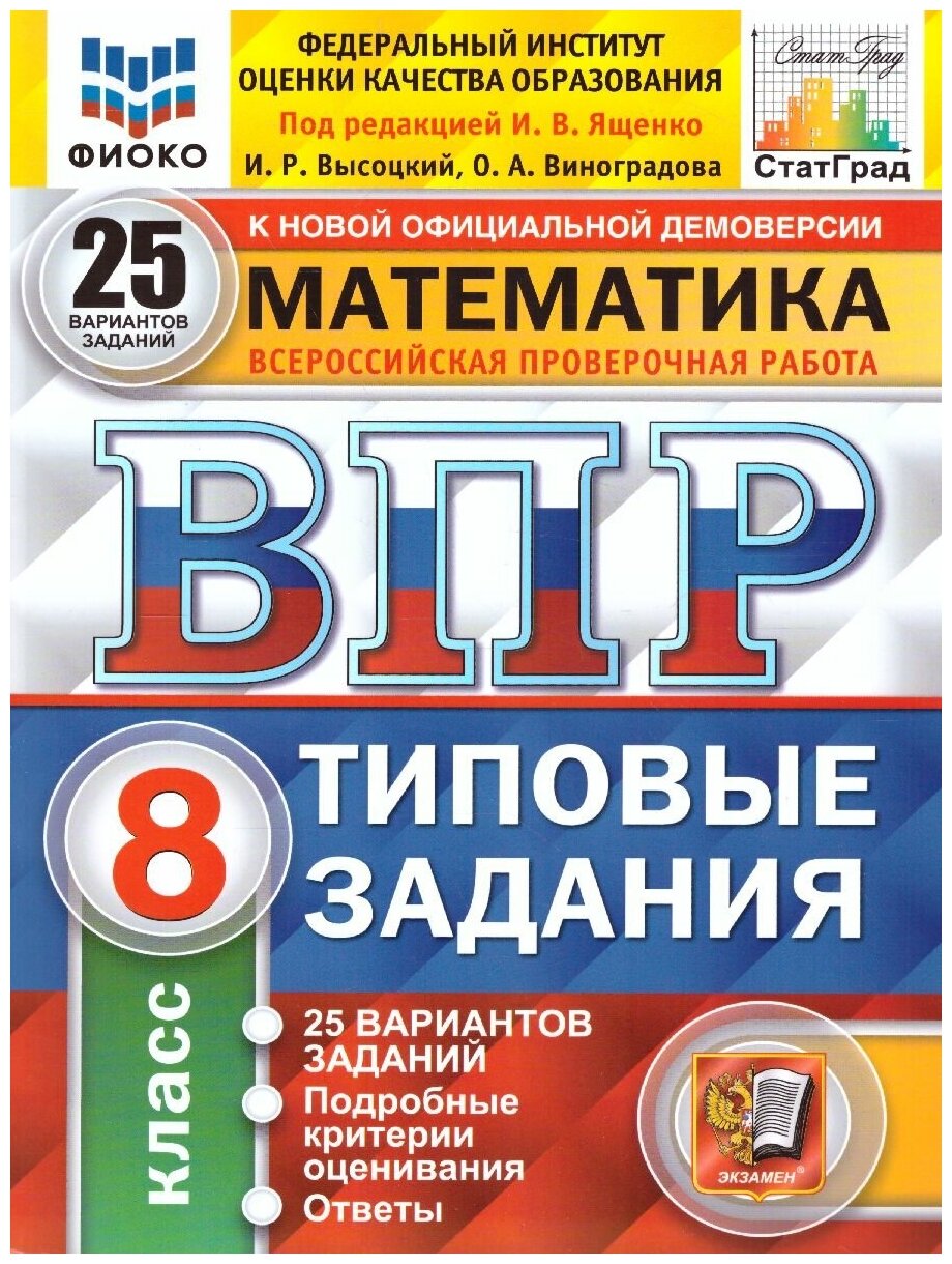 Математика Всероссийская проверочная работа 8 класс Типовые задания 25 вариантов заданий Подробные критерии оценивания Ответы (Высоцкий Иван Ростиславович); Экзамен, 2022