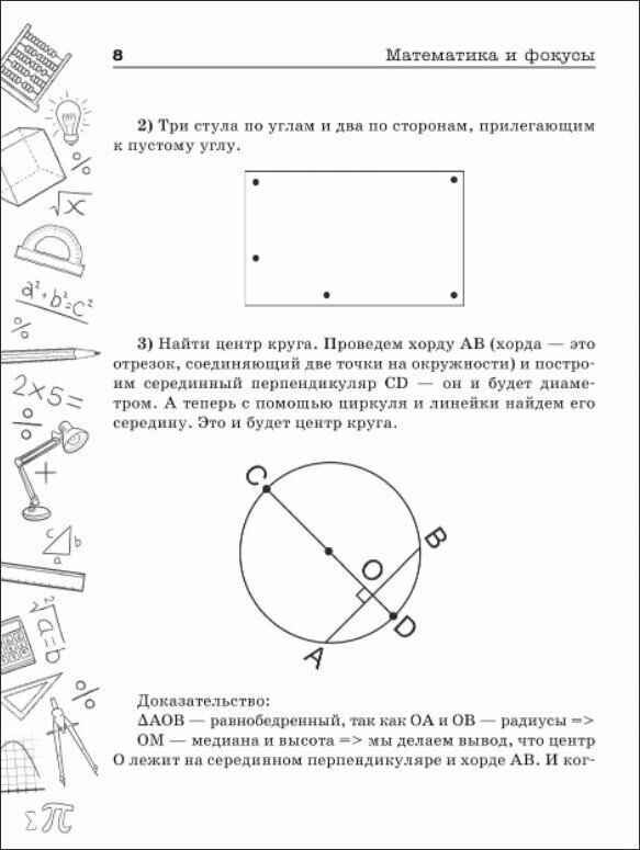Купил книгу Петра Земскова «Математика и фокусы. Геометрические головоломки для развития мозга». Прочитал первый параграф «Соседские задачи». Их автору в детстве загадывал его сосед Трофим Петрович. Всего пять задач, я честно их прорешал. Немного критики (хвала чуть позже). Давайте посмотрим на рисунок к решению задачи № 3 (илл. 1). Под ним читаем «ОА и ОВ — радиусы». У меня косоглазие что ли? Ларчик открывается просто, достаточно посмотреть на второй рисунок к задаче (илл. 2). Увы, центр окружности на первом рисунке съехал немного вниз. Печалька. Небрежность и в том, что в последней строчке можно прочесть «на серединном перпендикуляре и хорде АВ», а надо «к хорде АВ». Но больше всего меня удивило, что в начале доказательства ясно указано, что точка О — центр окружности (так как ОА и ОВ радиусы), а в конце вдруг «остаётся» только диаметр CD поделить пополам, чтобы найти его середину, то есть ту же самую точку О. Зачем?