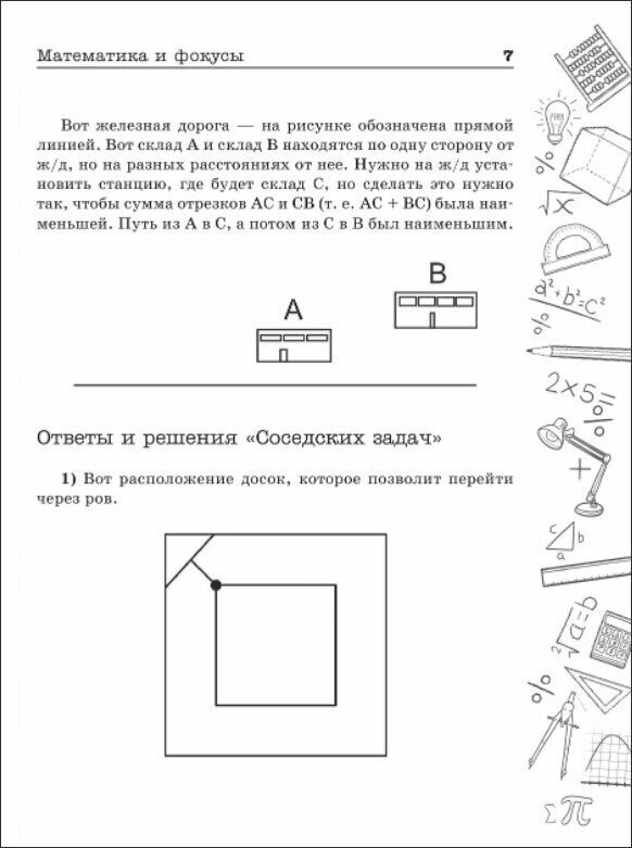 А вот задача № 5 (илл. 3). Надо на линии, изображающей железную дорогу, найти точку С, чтобы расстояние от неё до складов (точек А и В) было минимальным. В тексте подчёркнуто, что точки А и В «находятся по одну сторону от ж/д, но на РАЗНЫХ расстояниях от неё». А что мы видим на чертеже задачи (илл. 4)? Расстояние одинаково! Нет, в данном случае такое упрощение (всегда непростительное) не повлияло на правильный ход решения. Но обидно, эта задача действительно интересная, имеет красивое и оригинальное решение, головоломистая (это обещанная хвала)— и такая небрежность! И где? В рисунке! Увы, и это в первом параграфе, который является лицом книги. А книга, замечу, имеет подназвание «ГЕОМЕТРИЧЕСКИЕ головоломки». Я уверен, что Пётр Земсков правильно нарисовал все эти графики в рукописи (сам же был автором книги по математике с рисунками), красиво и без ошибок. Но недосмотрел гранки, что там получилось. А там бывают такие чудеса.
