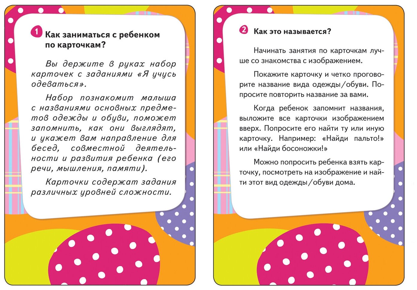 Данный набор простимулировал моего ленивого ребёнка к самостоятельному одеванию. Все просто, ведь на карточках представлены фотографии детей, а он любит им подражать. Огромное разнообразие предметов гардероба прекрасно развивают понятийную сферу и свои знания мы с лёгкостью применяем в обычной жизни. Советую к покупке.