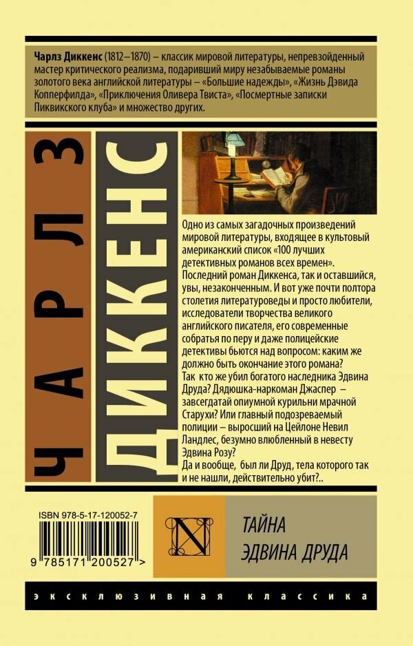 Классика английской литературы, последний и неоконченный детективный роман Чарльза Диккенса, очень интригующий и загадочный, читается легко, много персонажей и интереснейший описаний! Качество книги не самое лучшее, но и стоит она дёшево, зато легкая, можно носить с собой, и удобный, не сильно мелкий шрифт