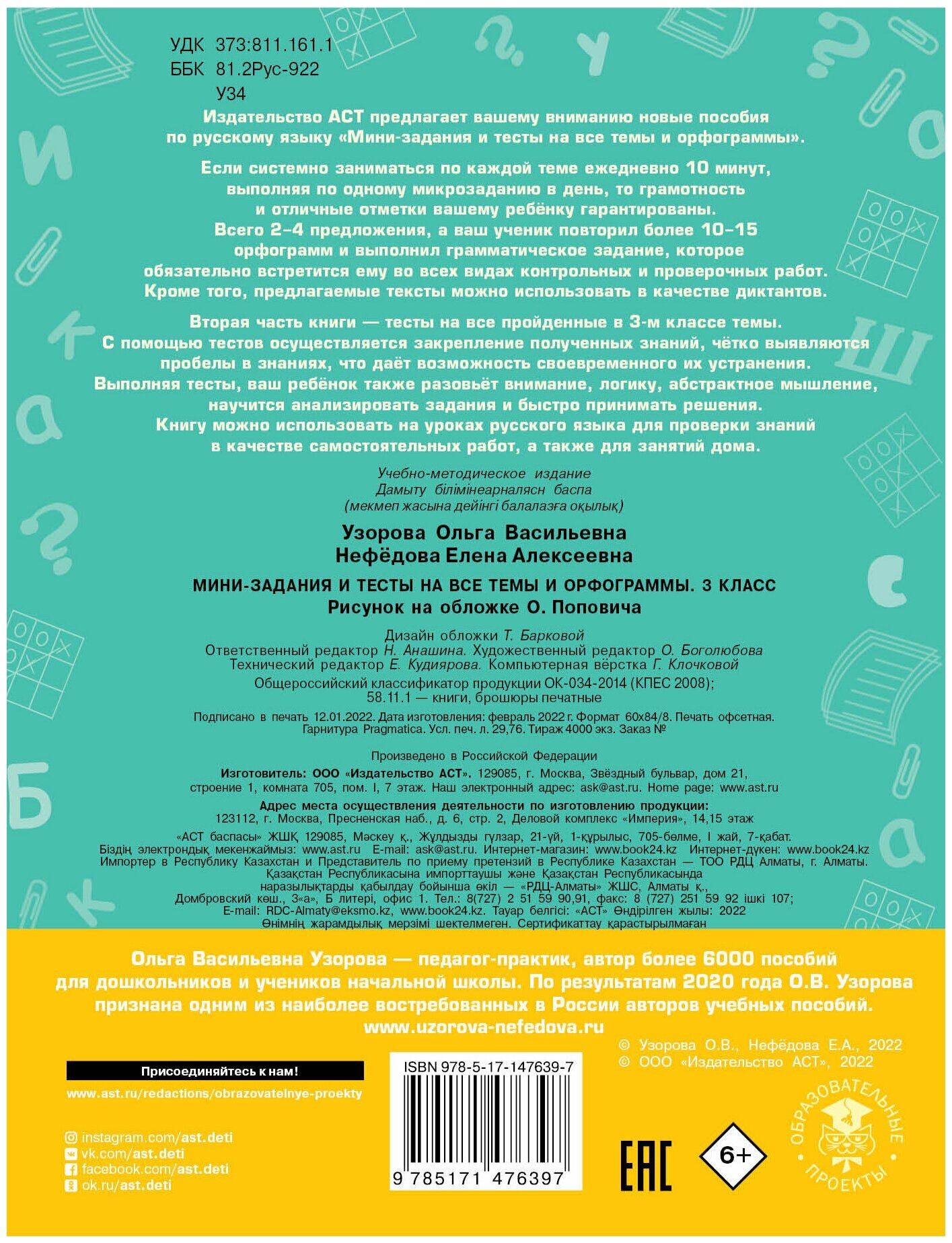 Русский язык. Мини-задания и тесты на все темы и орфограммы школьного курса. 3 класс (Узорова Ольга Васильевна, Нефедова Елена Алексеевна); ИЗДАТЕЛЬСТВО "АСТ", 2022