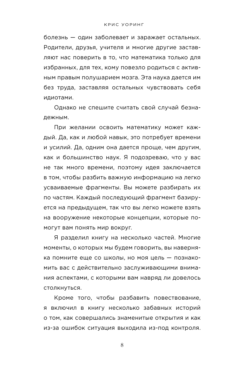 Математика — «королева наук». И, как любая королева, она кажется неприступной, холодной и надменной. Крис Уорринг предлагает взглянуть на изучение этой действительно сложной науки под другим углом, используя новый способ мышления.