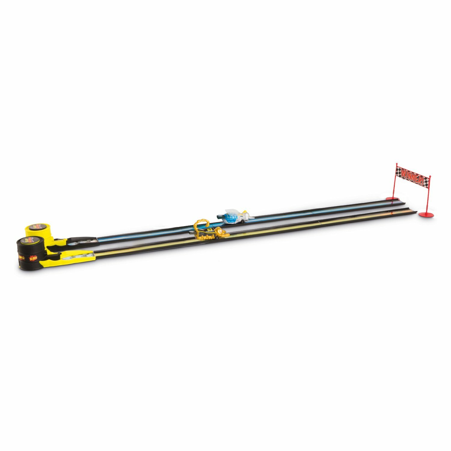 В комплекте: 2 машинки, 2 пусковых механизма, сборный трек 12 деталей, 2 листа наклеек, финишная лента, 2 листа наклеек, финишная лента.