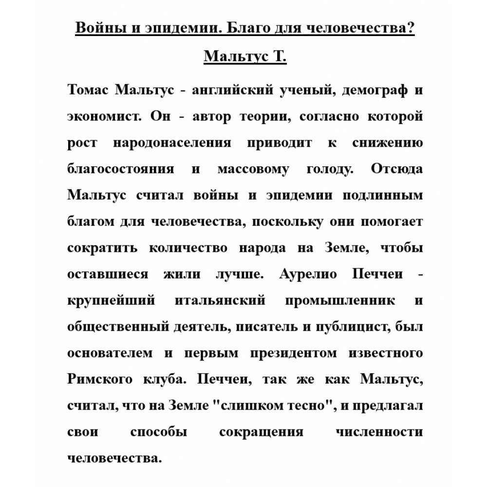 Томас Мальтус - английский ученый, демограф и экономист. Он - автор теории, согласно которой рост народонаселения приводит к снижению благосостояния и массовому голоду. Отсюда Мальтус считал войны и эпидемии подлинным благом для человечества, поскольку они помогает сократить количество народа на Земле, чтобы оставшиеся жили лучше. Аурелио Печчеи - крупнейший итальянский промышленник и общественный деятель, писатель и публицист, был основателем и первым президентом известного Римского клуба. Печчеи, также как Мальтус, считал, что на Земле "слишком тесно", и предлагал свои способы сокращения численности человечества.