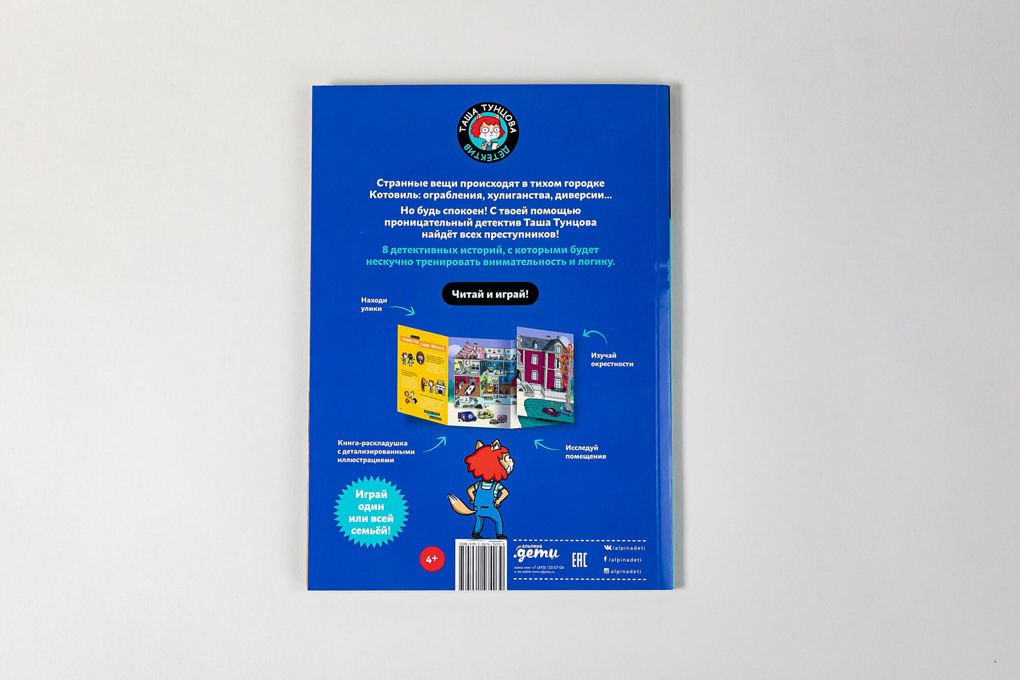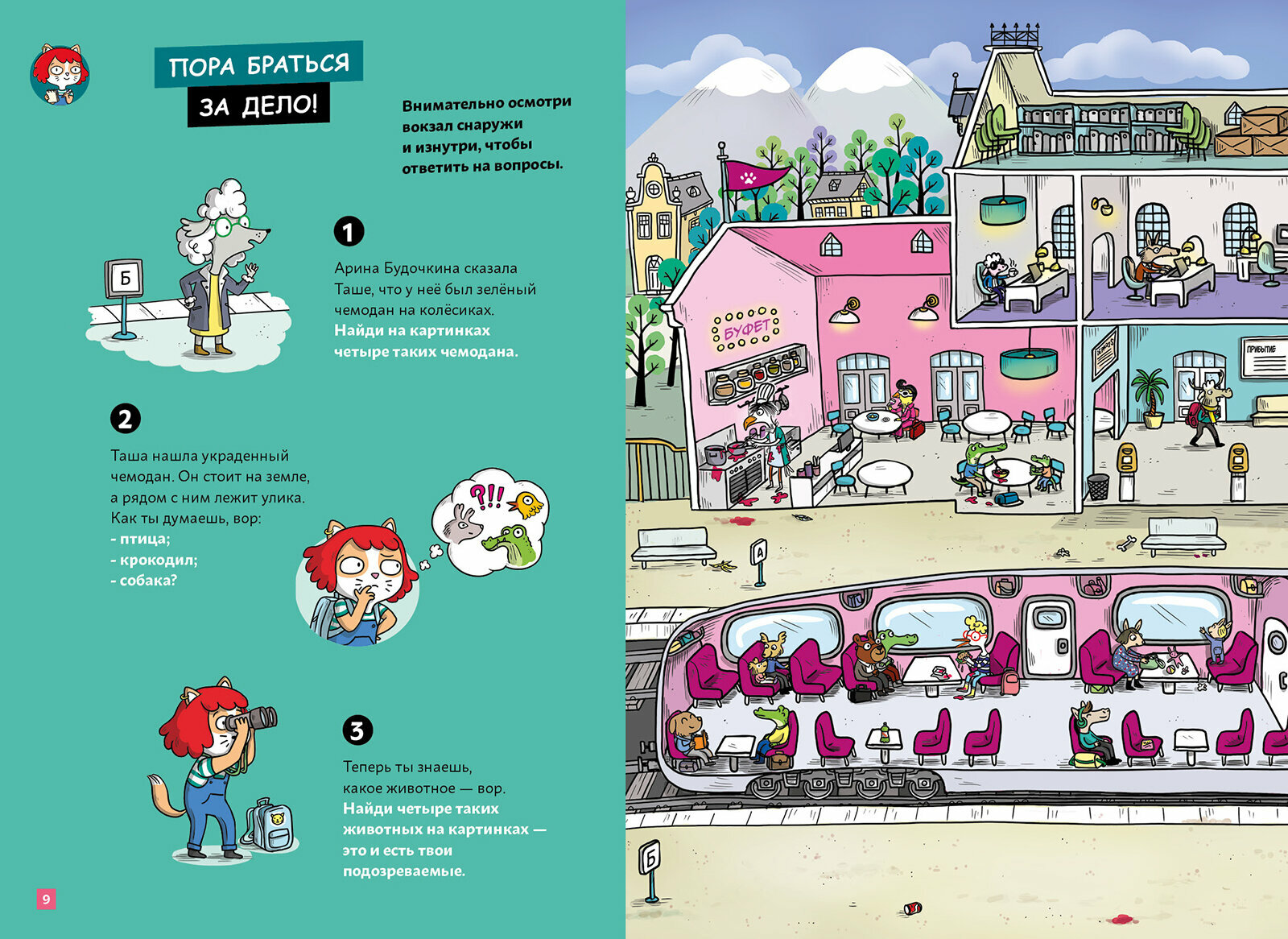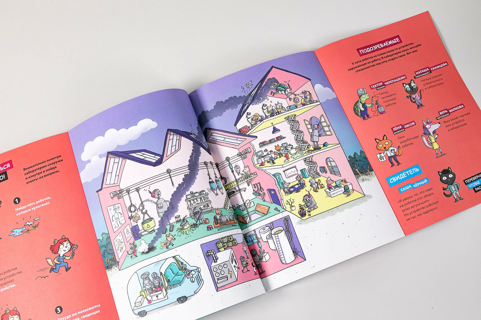 Маленьких детективов ждут 8 историй с заданиями, которые направлены на развитие внимания и умения строить логические цепочки. Сложность заданий растет с каждой историей, поэтому книга подойдет детям разных возрастов. Рассматривайте картинки и ищите на них улики с ребятами 3-4 лет. Разбирайтесь в первых детективных историях с детьми 5-6 лет. Распутывайте хитросплетения улик и показаний свидетелей вместе с ребятами 6-7 лет.