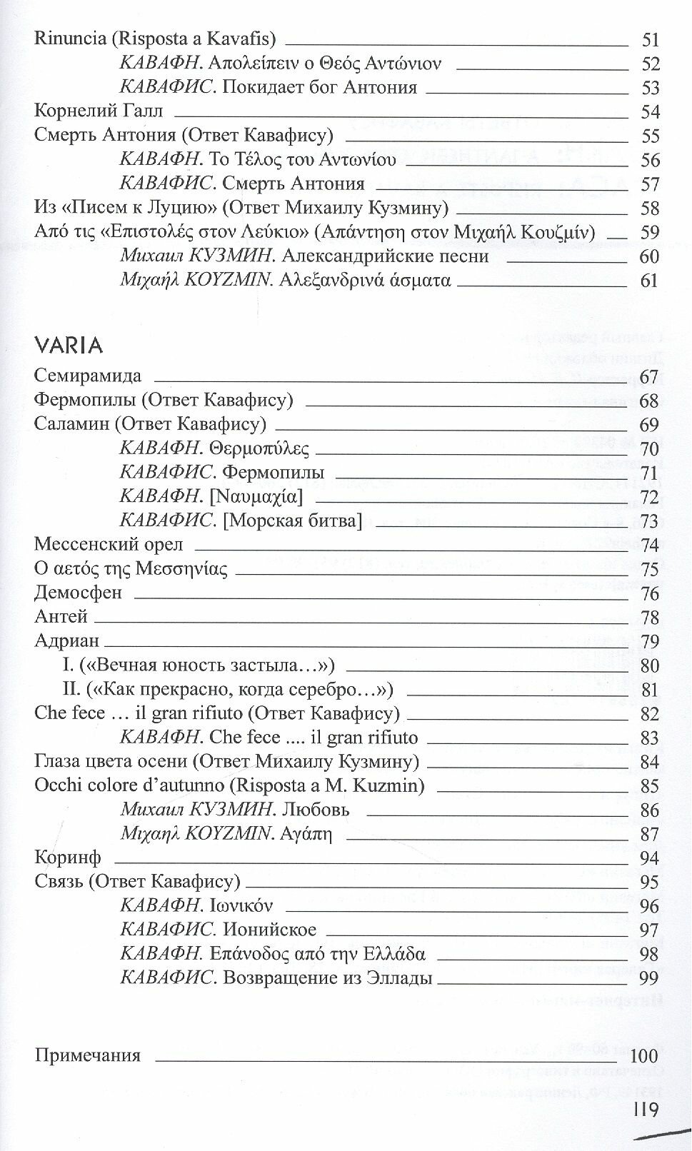 Сборник поэтических и филологических опытов, оригинальных стихов и переводов, явившихся результатом осмысления и переосмысления творений поэтов-филологов К. Кавафиса и М. Кузмина и филолога-поэта С. Аверинцева. В стихах, многие из которые составлены в разноязычных вариантах (на русском и на языках-«наследниках» классических языков — новогреческом и итальянском), происходит игра с историей, но не только. Это своего рода александризм, в котором Александрия как символ особого рода поэзии становится основополагающей, ностальгической и желанной Итакой.