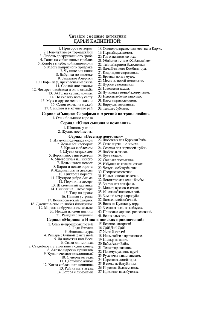 | Серия | Иронический детектив Дарьи Калининой. Новое оформление (обложка) |