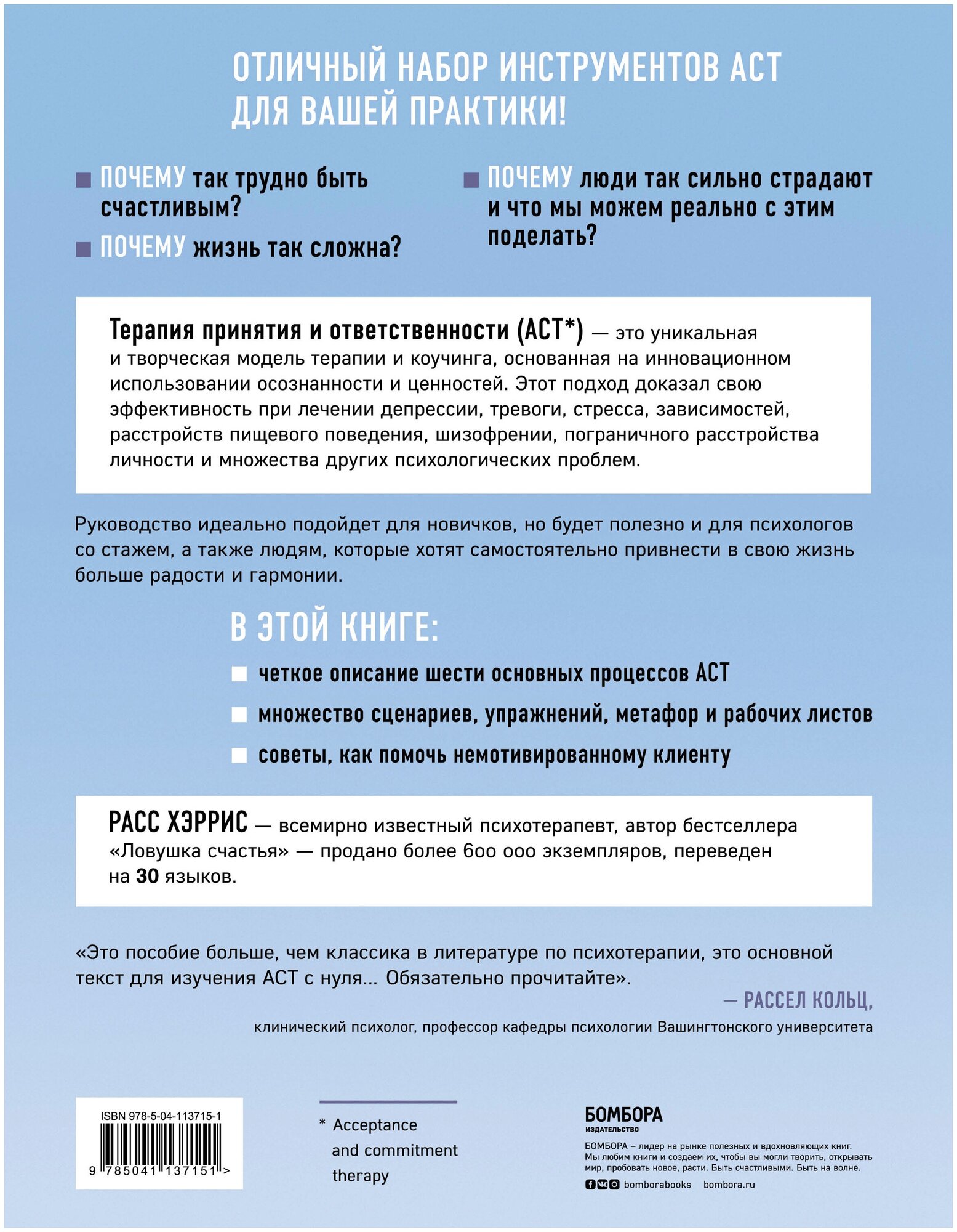 Почему так трудно быть счастливым? Почему жизнь так сложна? Почему люди так сильно страдают? И что мы можем реально с этим поделать? Терапия принятия и ответственности (ACT) — это уникальная и творческая модель терапии и коучинга, основанная на инновационном использовании осознанности и ценностей. Этот подход доказал свою эффективность при лечении депрессии, тревоги, стресса, зависимостей, расстройств пищевого поведения, шизофрении, пограничного расстройства личности и множества других психологических проблем.