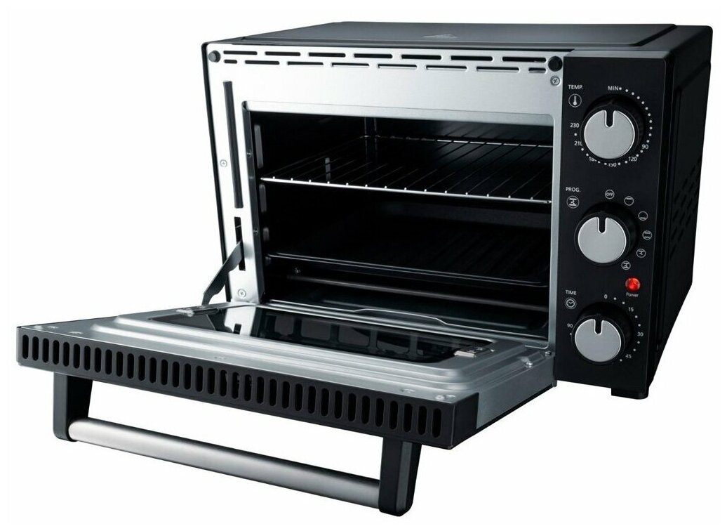Ручка защищена от нагревания, что позволит не использовать дополнительно прихватки и исключит ожоги. Справа от дверцы находятся поворотные переключатели, при помощи которых вы сможете настроить температуру, время работы печи, а также установить программу.