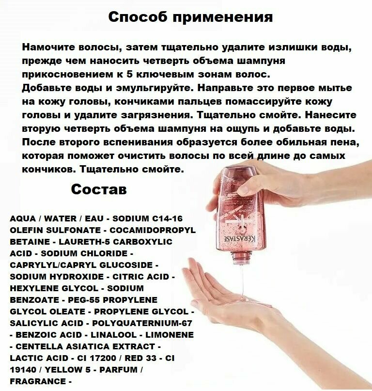 Способ применения: Намочите волосы, тщательно отожмите лишнюю воду и нанесите каплю шампуня размером с пятирублевую монету на пять основных зон головы. Добавьте воды и помассируйте волосы.
