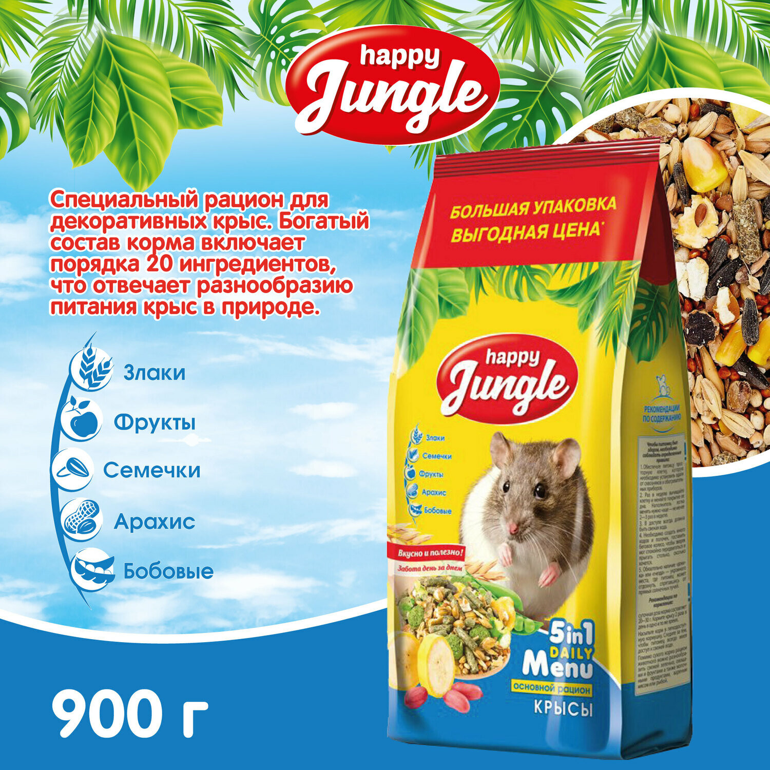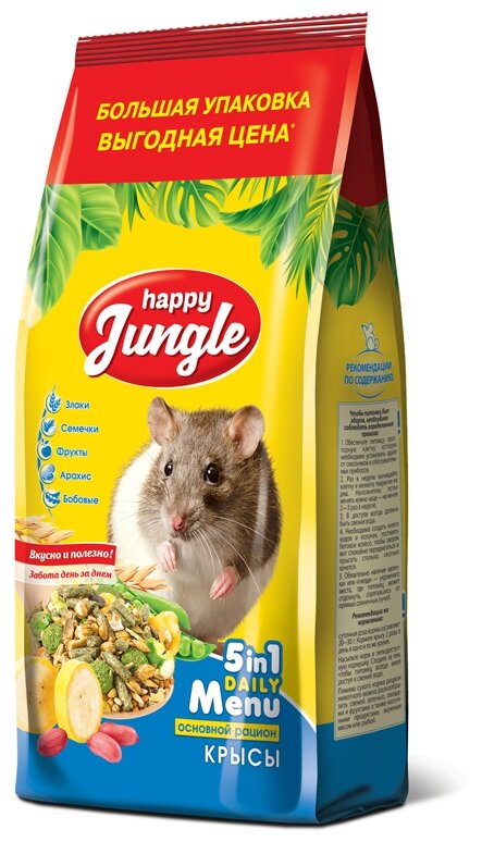 Happy Jungle – корм для крыс. Сбалансированная смесь из зерна и зерновых гранул, фруктов, семечек и арахиса обеспечит животное всеми питательными веществами.Злаки и бобовые - составляют основу рациона, обладают высокой питательной и энергетической ценностью.