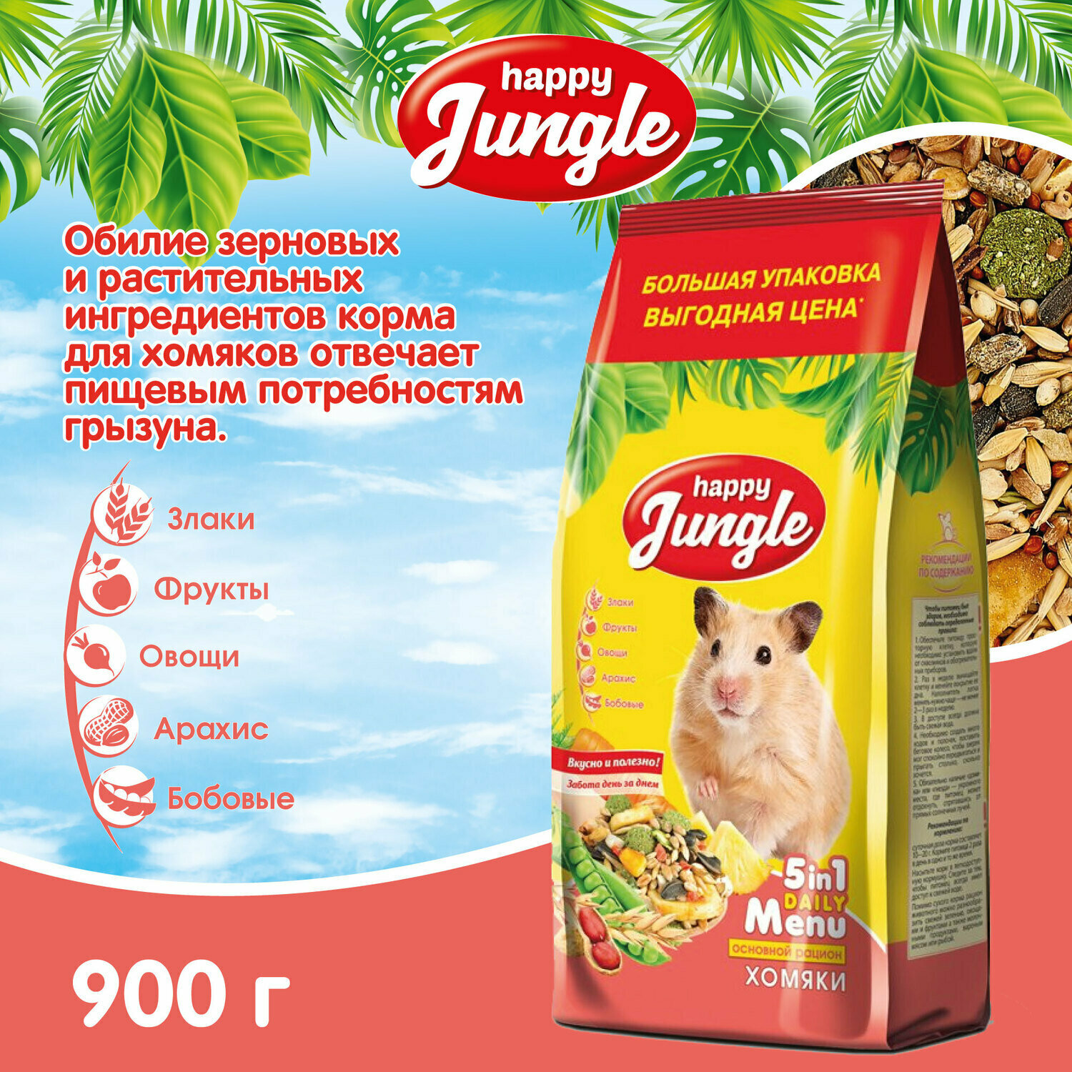 Happy Jungle – корм для хомяков.Сбалансированная смесь из зерна и зерновых гранул, овощей, фруктов и арахиса обеспечит животное всеми необходимыми питательными веществами.
