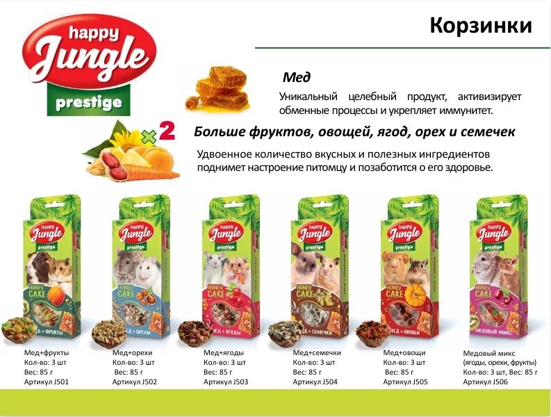 Happy Jungle Prestige – это линейка улучшенных кормов и лакомств для грызунов и кроликов. Рецептуры обогащены специальными компонентами, которые приносят еще больше пользы питомцу и облегчают его содержание.