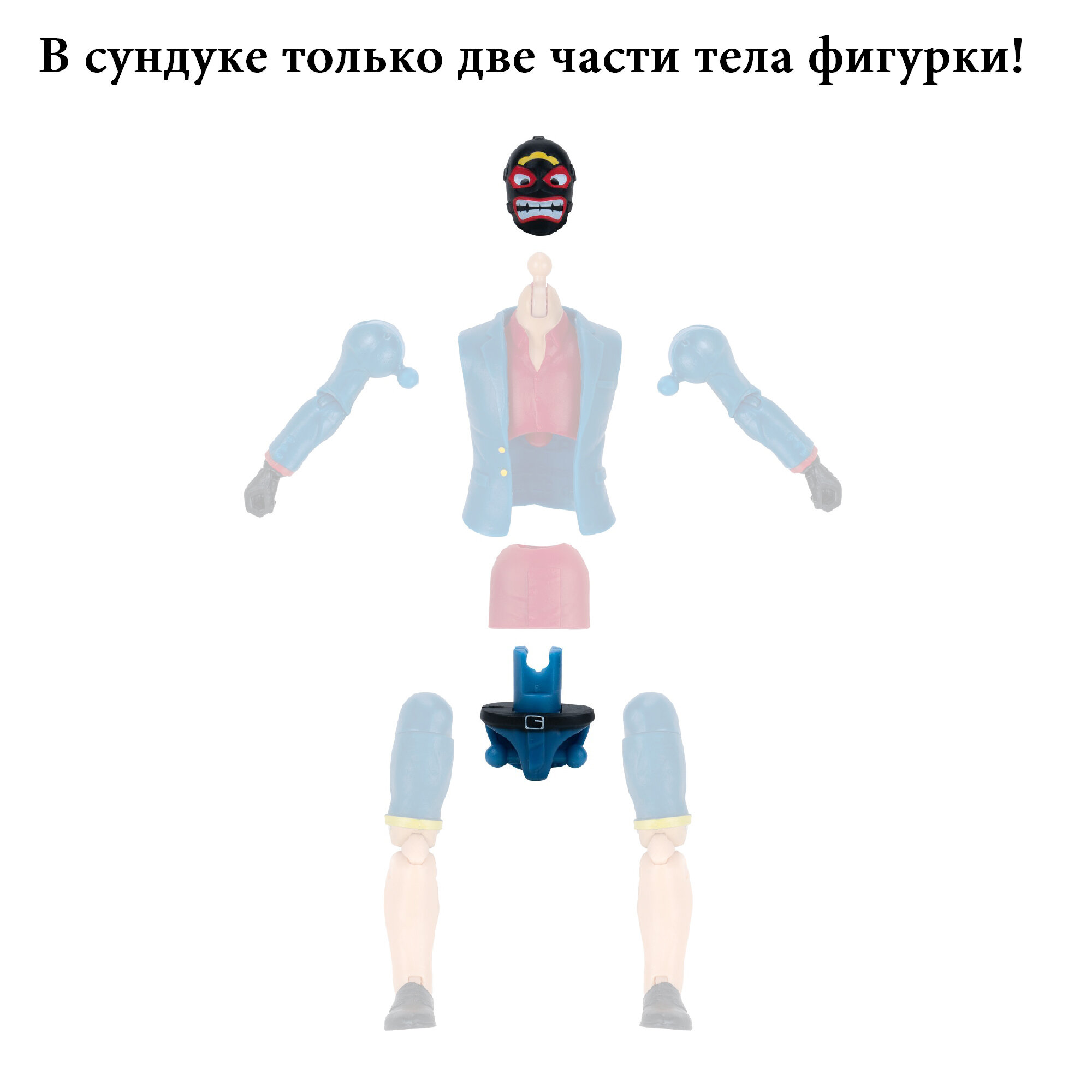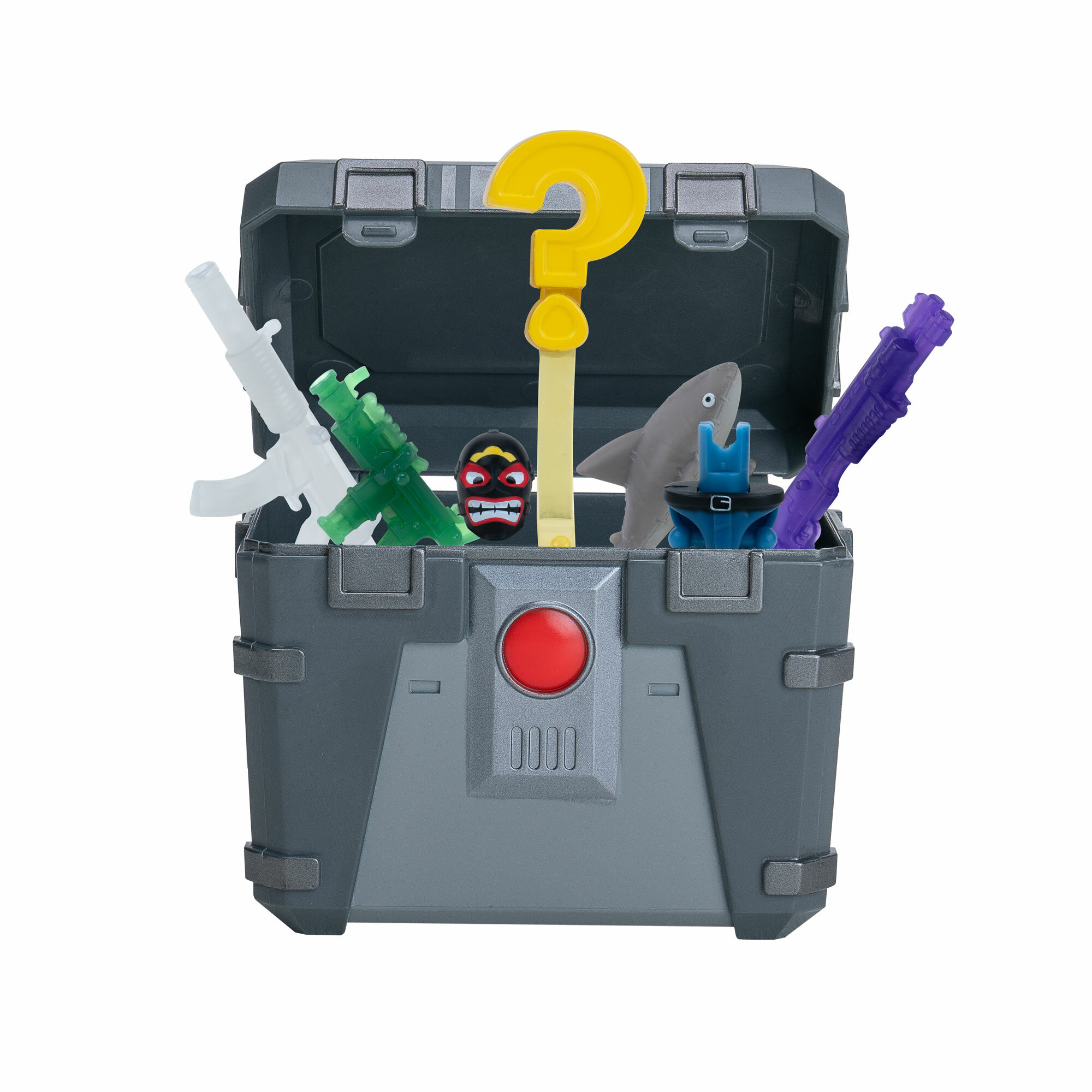 Сундук Фортнайт с несколькими видами оружия и 2 деталями туловища фигурки Shark с 28 точками артикуляции. Собрав 8 элементов туловища в сундуках их разных наборов, можно построить фигурку и использовать найденные аксессуары и оружие.