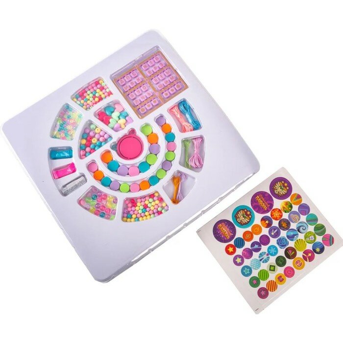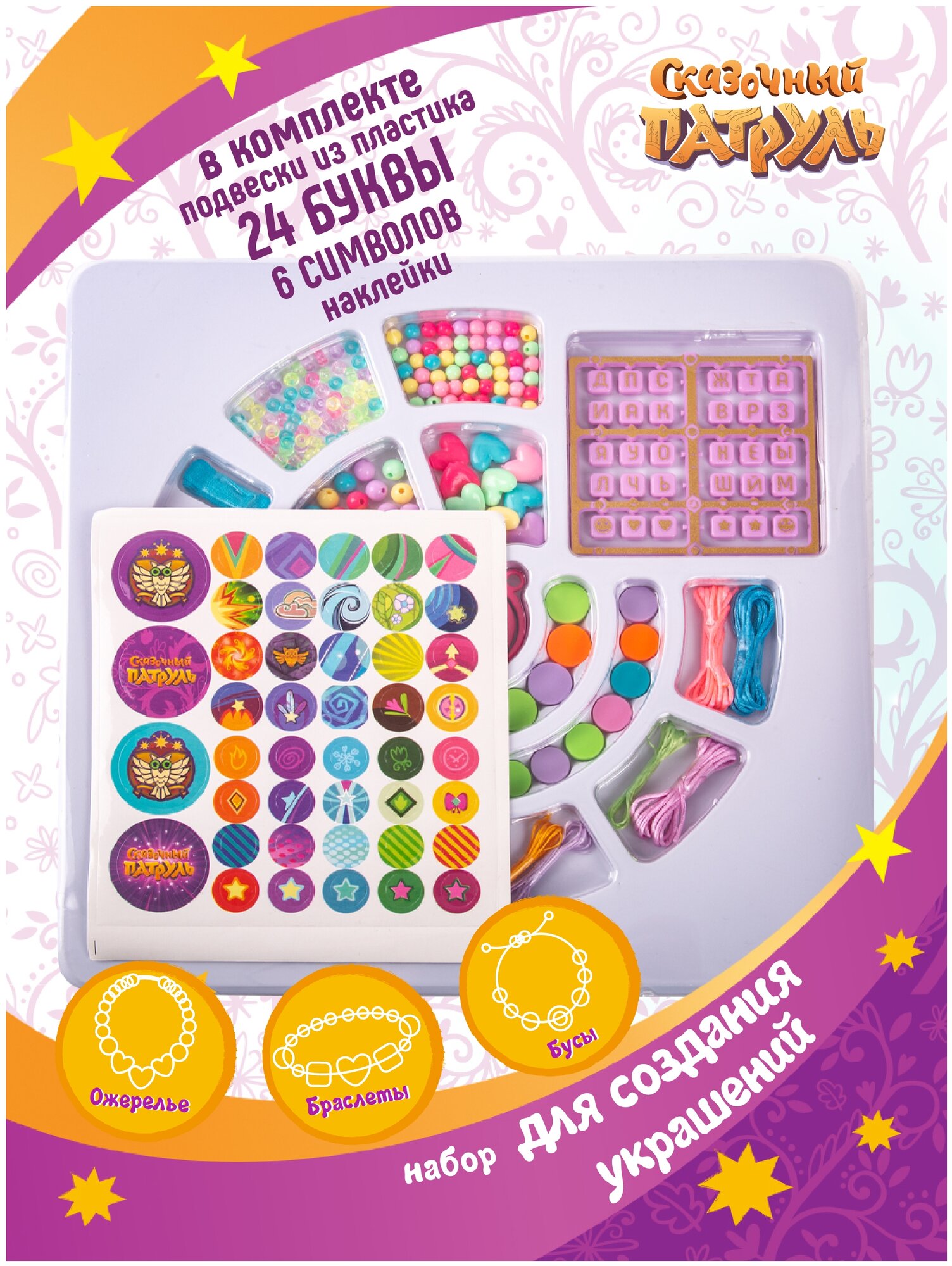 В твоем распоряжении: целых 6 видов бусин, подвески из пластика, которые можно украсить наклейками имена любимых героинь сериала «Сказочный Патруль». А еще в наборе целых 40 буков, звездочки, сердечки и смайлик и пробел.