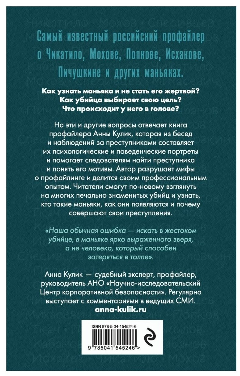 "Книга произвела на меня сильное впечатление. Написана профессионально, со знанием предмета. Легко читается. Автором проделана огромная работа. Прежде чем начать увлекательный рассказ об отдельных преступниках, она знакомит читателей с базовыми представлениями о том, кто такие серийные убийцы и маньяки. Раскрывая эти понятия, Анна Кулик опирается на мнения многих известных специалистов в этой области, таких как Антонян, Бухановский и других. В соответствующих главах автор убедительно описывает процесс того, как конкретные личности становились маньяками. Рекомендовал бы эту книгу работникам следственных органов и всем интересующимся криминологией". - АМУРХАН ЯНДИЕВ, полковник юстиции в отставке, участвовал в поимке серийных убийц Чикатило, Муханкина и других преступников.