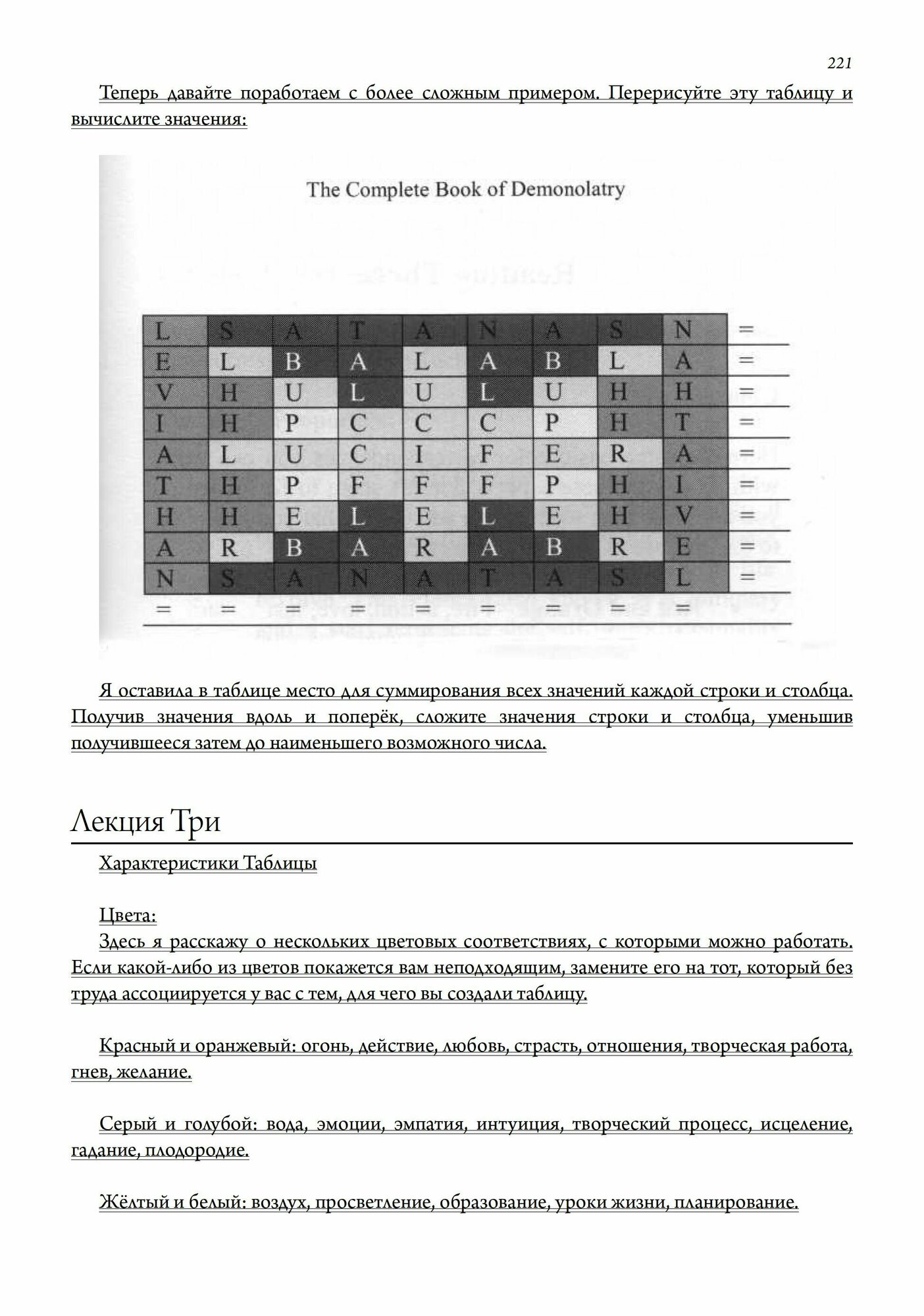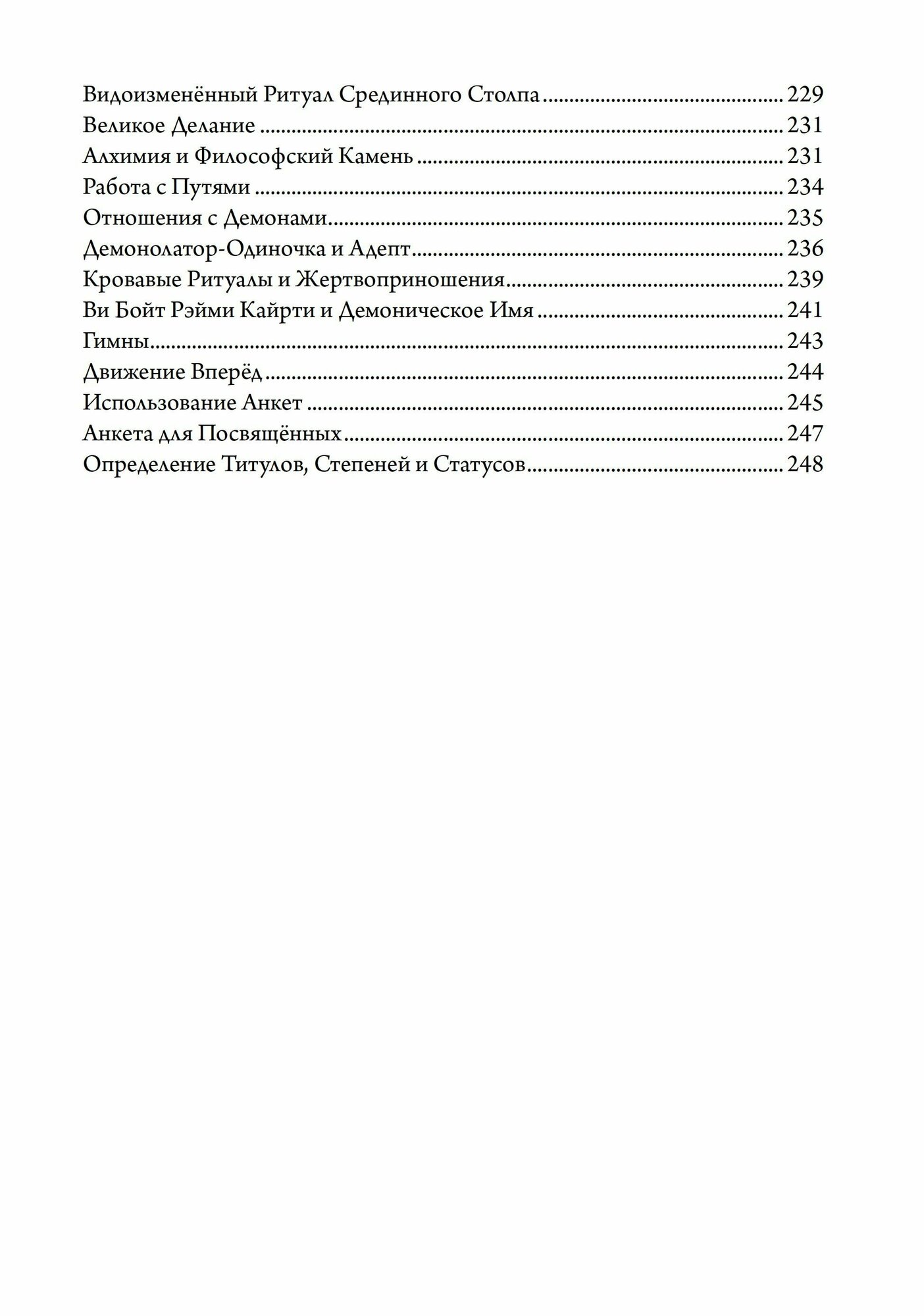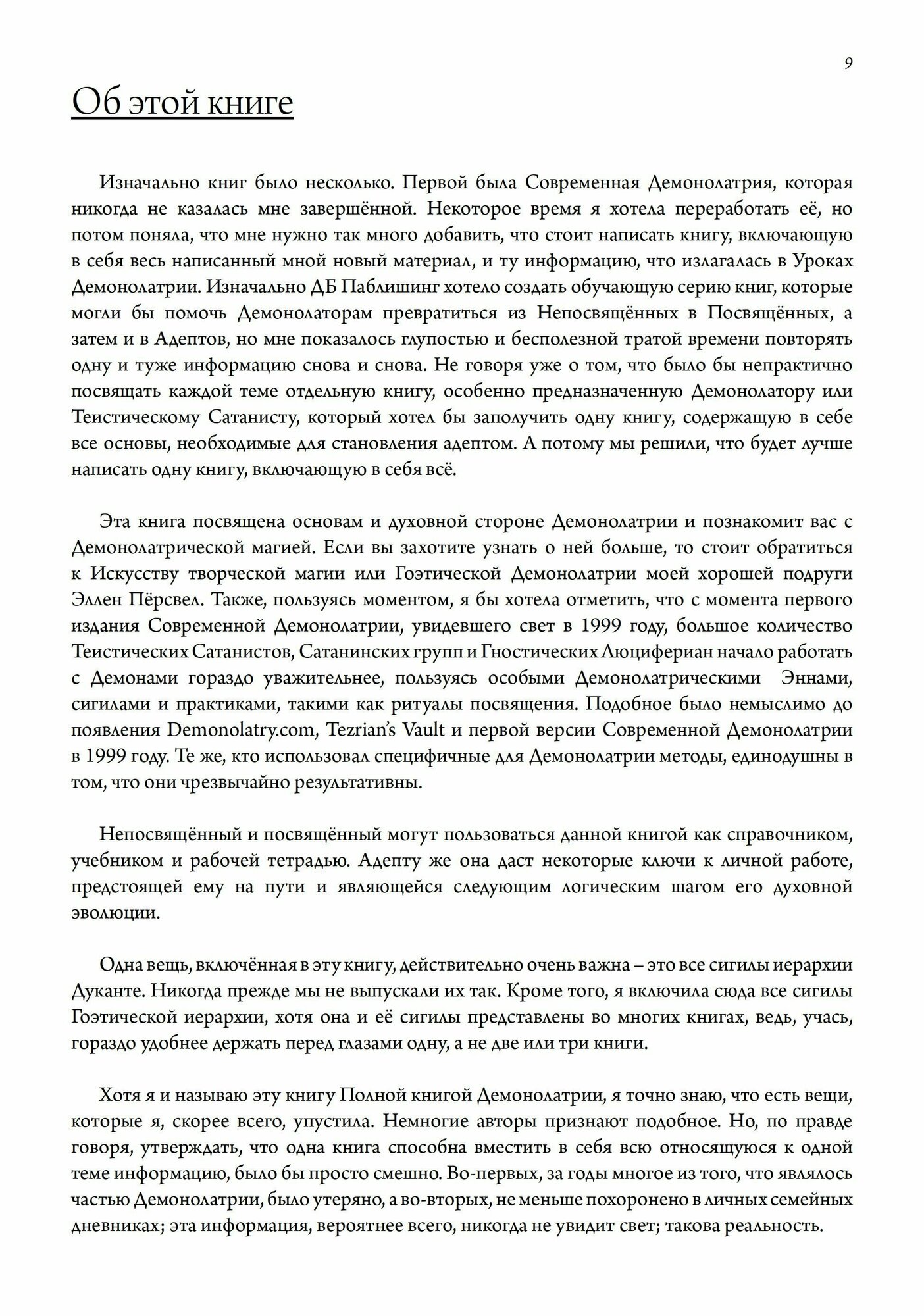 Откройте для себя мир мощных ритуалов, магических техник и практик, при выполнении которых почитаются Сатана и Демоны. Узнайте, как и почему Энны, Демонолатрические Сигилы, восхождения и другие привычные для Демонолаторов практики становятся обычными в среде Теистических Сатанистов. Эта необыкновенная работа по Демонолатрии способна провести ученика по пути от непосвящённого к адепту. Кроме всего прочего, в ней освящаются глубины Демонолатрической сексуальной магии, некромантия, кровавые обряды и жертвоприношения. Демонолатрические жрецы используют этот текст для обучения членов своих ковенов. Частью он представляет собой учебник, частью справочник, частью обучающее пособие. В этой книге есть главы по демонологии, истории, Демонолатрических Праздниках, подношениях, молитвах, Эннах, сигилах, религиозных ритуалах и Демонолатрической Магии. Это, однозначно, самая полная из книг по Демонолатрии, которая когда-либо была написана.
