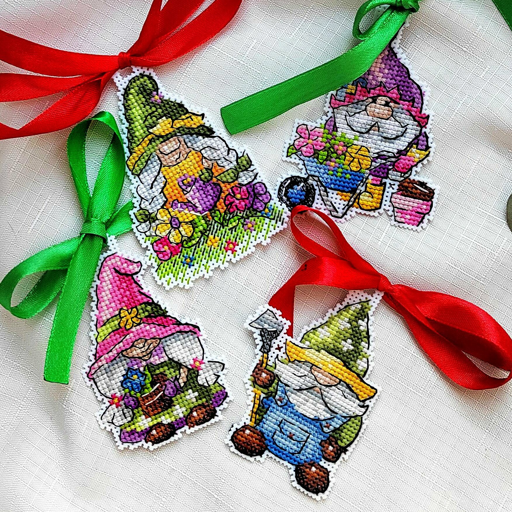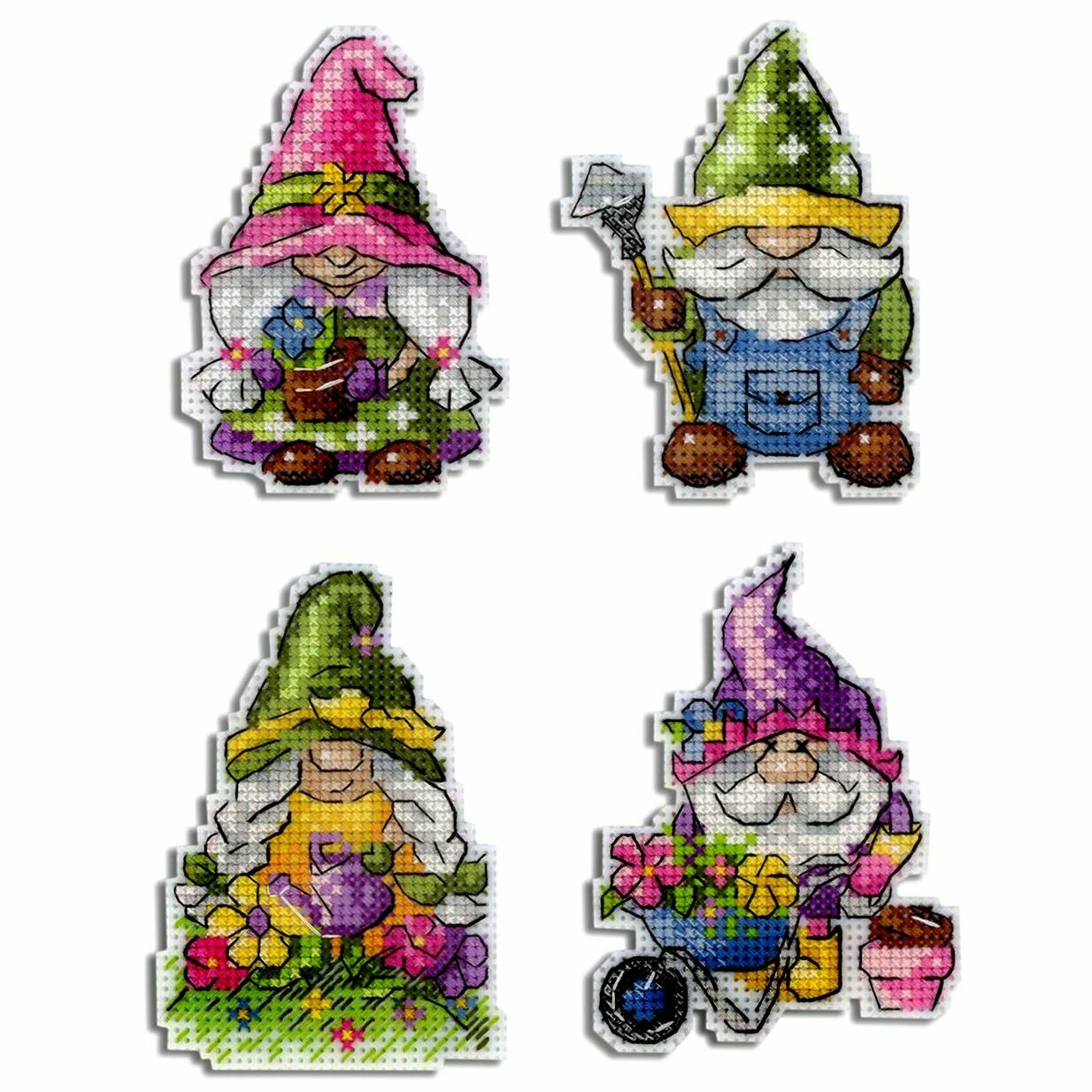 Вышитые магниты 'Садовые гномики' – это оригинальные сувениры и превосходный подарок. Магнит украсит дверцу холодильника и любую металлическую поверность. Чтобы сделать такой сувенир, достаточно владеть техникой 'крест'. Пяльцы или рамки не понадобятся – пластиковая канва отлично держит форму. Готовые элементы надо вырезать по контуру. К оборотной стороне фиксируется фетр, который маскирует изнанку, и затем фиксируется магнитное полотно.
