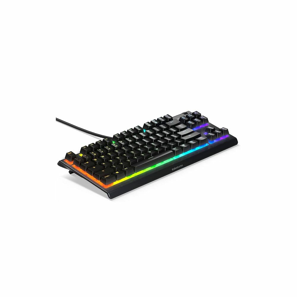 SteelSeries Apex 3 TKL RU представляет собой укороченную игровую клавиатуру без цифрового блока с проводным подключением и мультицветной подсветкой. Она выполнена в пыле- водонепроницаемом корпусе и комплектуется удобной подставкой под запястья. Модель подключается посредством USB-интерфейса, используя кабель длиною 1.8 метра. Для его комфортной прокладки, в днище аксессуара имеется продуманный кабель канал. Дизайн Укороченная игровая клавиатура SteelSeries Apex 3 TKL RU оснащена мембранными переключателями Whisper с низким коэффициентом трения, обеспечивающими практически бесшумное нажатие и отличающиеся непревзойденной долговечностью – выдерживают более 20 миллионов нажатий. Рама модели имеет 3 встроенных канала, в которых кабель может выходить из клавиатуры, что обеспечивает чистоту и безопасность вашего стола. Комфорт и функциональность Клавиатура SteelSeries Apex 3 TKL RU поддерживает зональную RGB-подсветку, которая может быть настроена по 8 отдельным группам клавиш. Также доступны всевозможные эффекты, позволяющие персонализировать игровой девайс под свой стиль. В модели имеется специальный ролик, позволяющий управлять мультимедией и поддерживающий нажатие. Особенности:Укороченный дизайн Влагозащищенный корпус Зональная RGB-подсветка Продуманный кабель-канал Фактурный ролик управления мультимедией