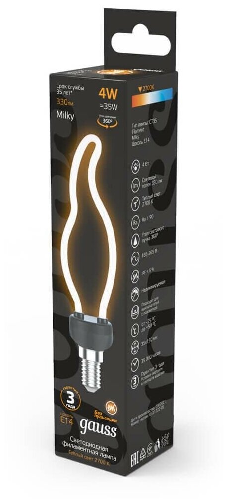 На сегодняшний день товар «Светильник Gauss Лампа Filament LED Artline milky Е14 CT35 4W 330lm 2700К» можно купить с кешбеком в 2 магазинах: Яндекс.Маркет, xcom-shop