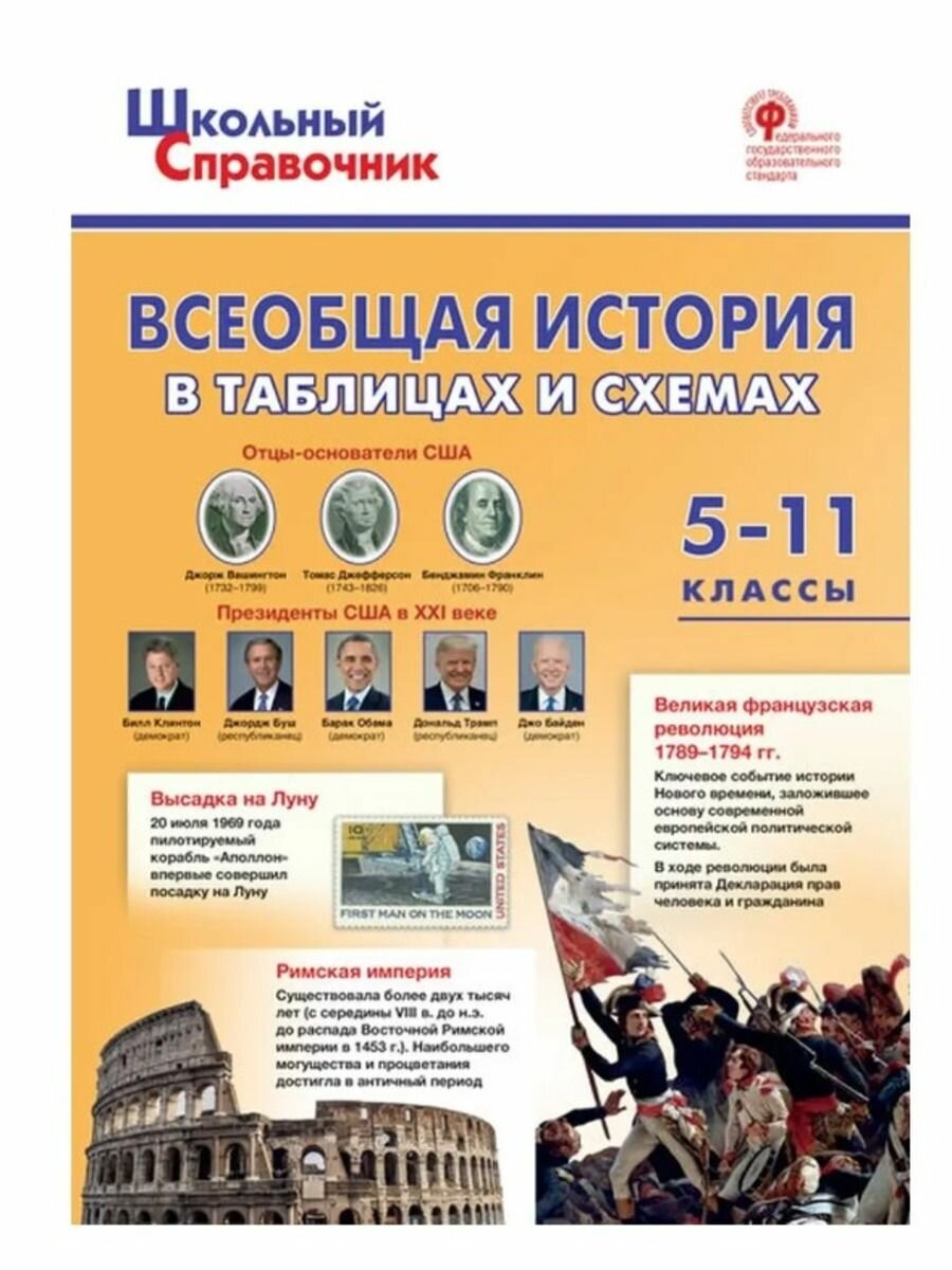 В данном справочнике представлены основные темы по Всемирной истории в виде таблиц и схем в достаточно сжатом виде. Можно рекомендовать его использовать в качестве повторения пройденного. Материал чётко структурирован по историческим периодам, странам. Всё пройденное за 5-11 класс представлено. Подходит для обобщения материала при подготовке к ЕГЭ по истории. Качественная печать.
