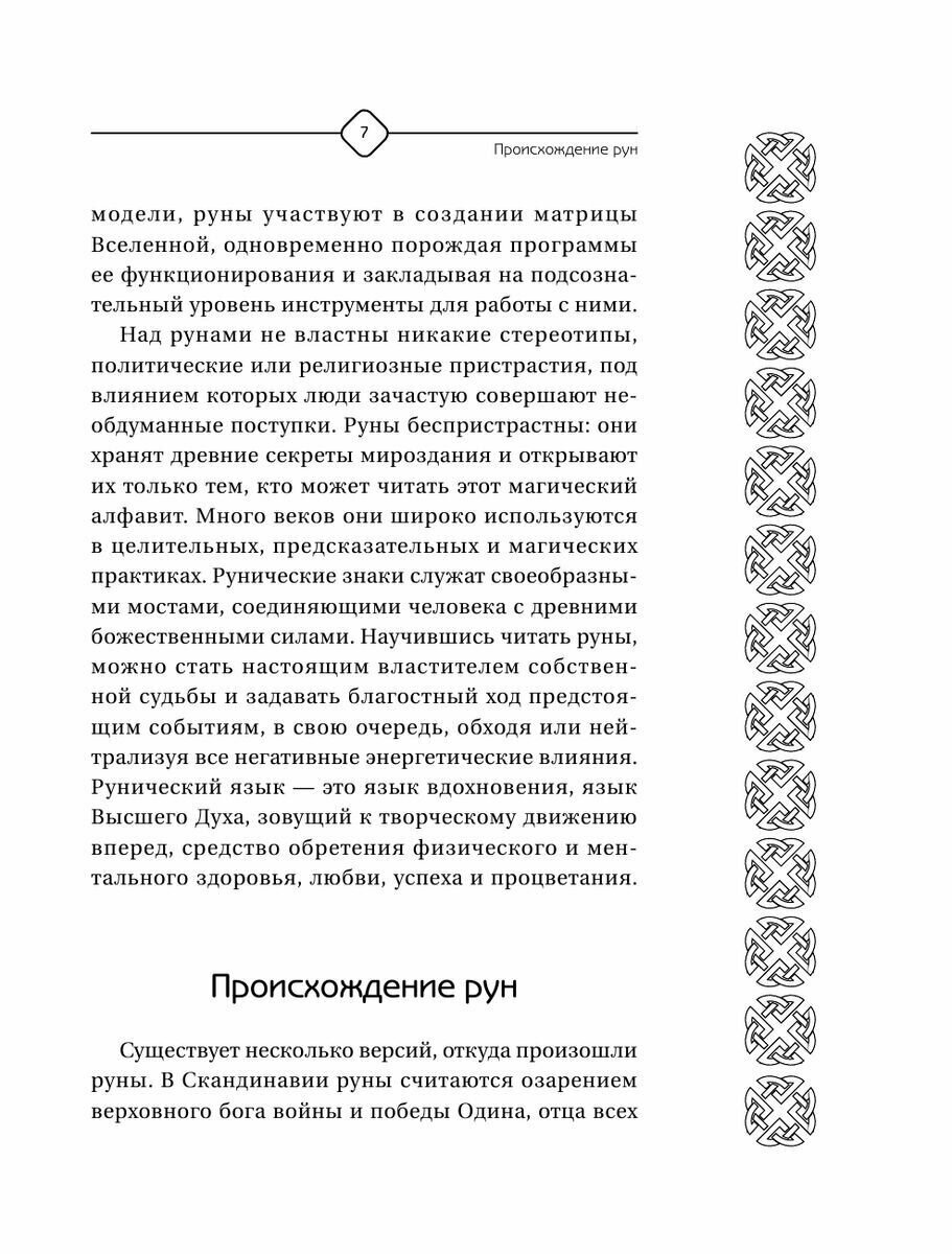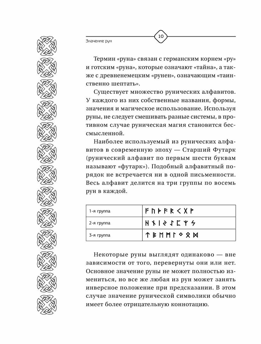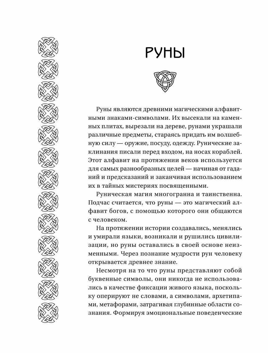 Снова и снова обращаясь с вопросом к рунам, размышляя над их толкованием, вы прикоснетесь к древней мудрости, научитесь понимать значения рунических комбинаций и использовать их, чтобы улучшить жизнь свою и других людей. Руны помогут вам предсказать будущее, дадут ответ в затруднительной ситуации и укажут выход из тупика. Они станут вашим талисманом удачи, защитником и соединят с космическими энергиями.