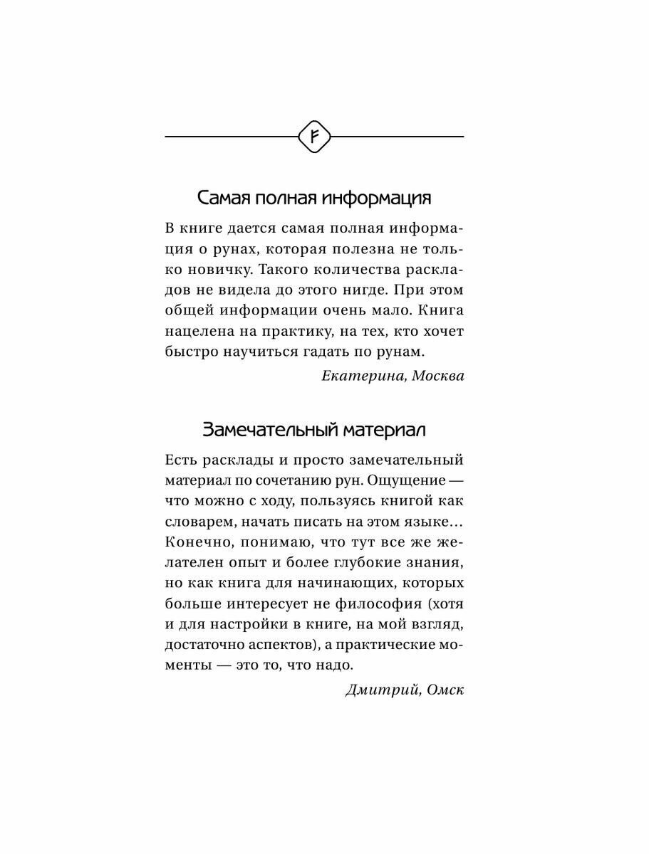 Книга подойдёт только тем, кто начинаем знакомство с рунами и никакой информацией ещё не владеет. В ней описывается, что такое руны, откуда они произошли, трактовки. Меня подкупило в названии «3000 комбинаций и их толкований», но толкования оставляют желать лучшего, трактование трёхрунного расклада одним словом ни как не может дать какой нибудь информации. Не приятно удивлена и расстроена такой покупкой.