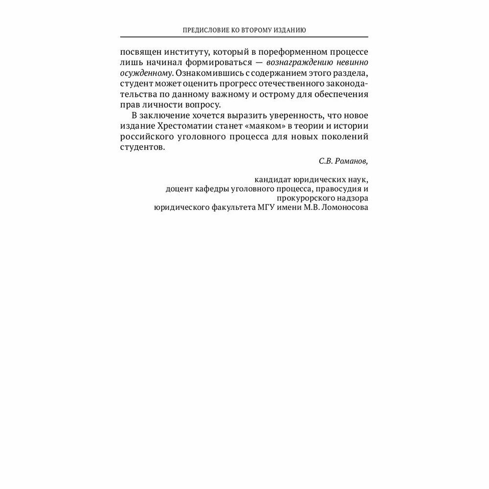 Отбор научных материалов и последовательность расположения разделов подчинены логике изучения уголовного процесса. Новое издание сопровождается предисловиями учеников профессора Э.Ф. Куцовой — доцентов кафедры уголовного процесса, правосудия и прокурорского надзора юридического факультета МГУ имени М.В. Ломоносова Н.В. Ильютченко и С.В. Романова.