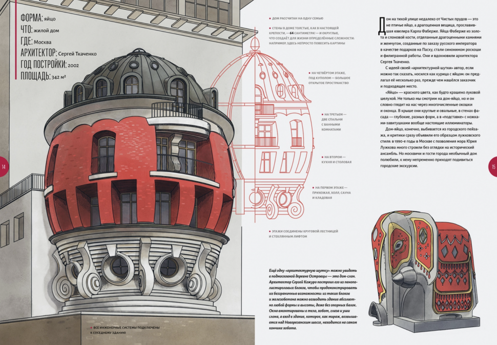 Тексты удивительно подходят к иллюстрациям: короткие пояснения тут и там, пара общих абзацев про здание - все работает на общую концепцию красивого альбома, который листаешь чтобы просто порадовать глаз. А читать или нет - это уже на твой выбор.
