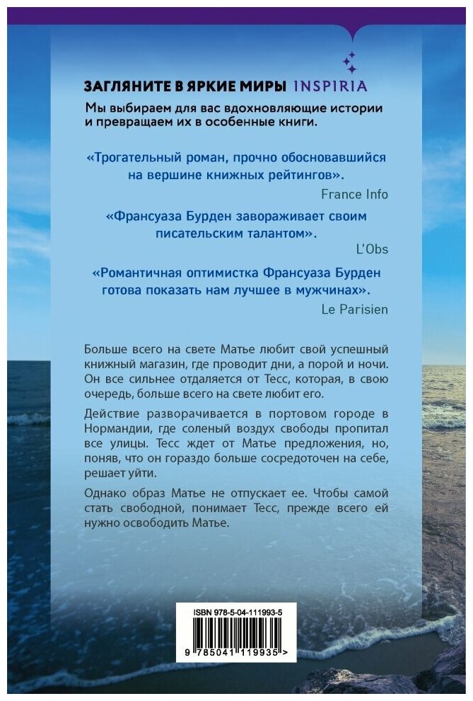 Книжный магазин, живописный регион Франции, море: все это, подобно сверкающим кусочкам мозаики, рисует перед читателем красивую и эмоциональную историю. Франсуаза Бурден с особой тонкостью описывает чувства и мысли главных героев. Было бесконечно приятно читать этот роман, и не менее приятно возвращаться к нему мыслями после прочтения.