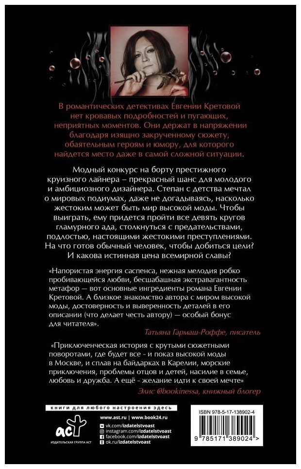 Рекомендую книгу, если хотите погрузиться в атмосферу морского круиза, понаблюдать за конкурсом и конкуренцией среди модных дизайнеров, пережить волнующую историю любви и переживать за героев до последней строчки! Саспенс в книге постепенно набирает обороты, а в финале достигает высшего напряжения.