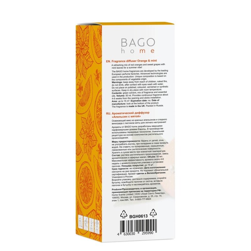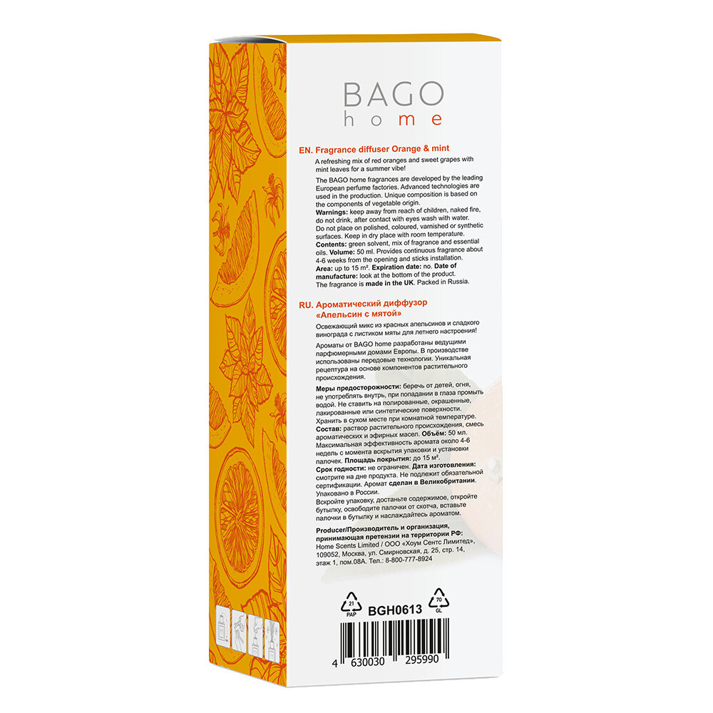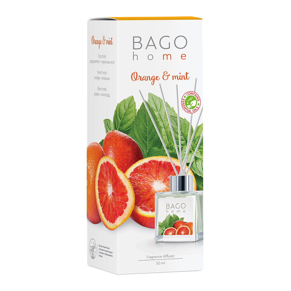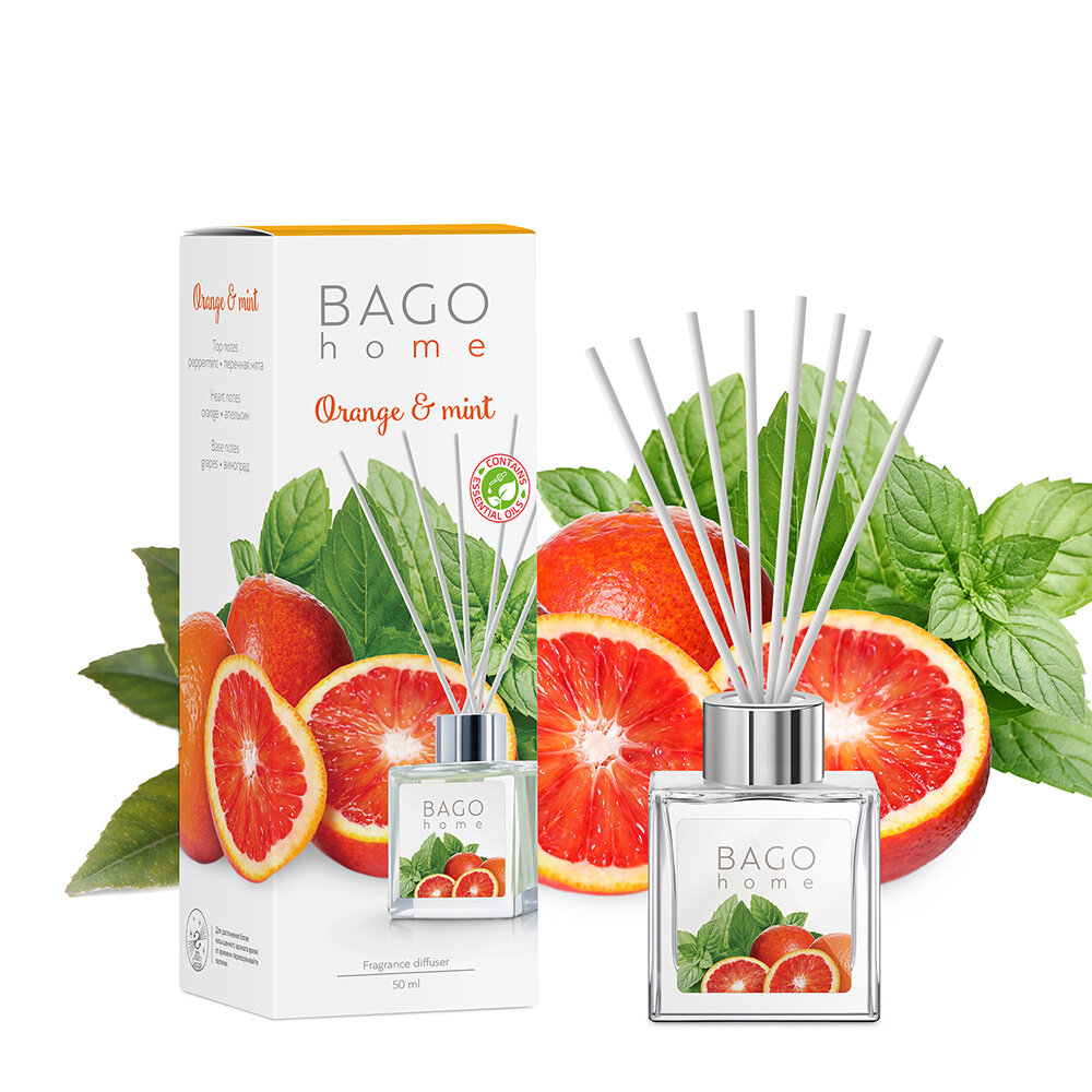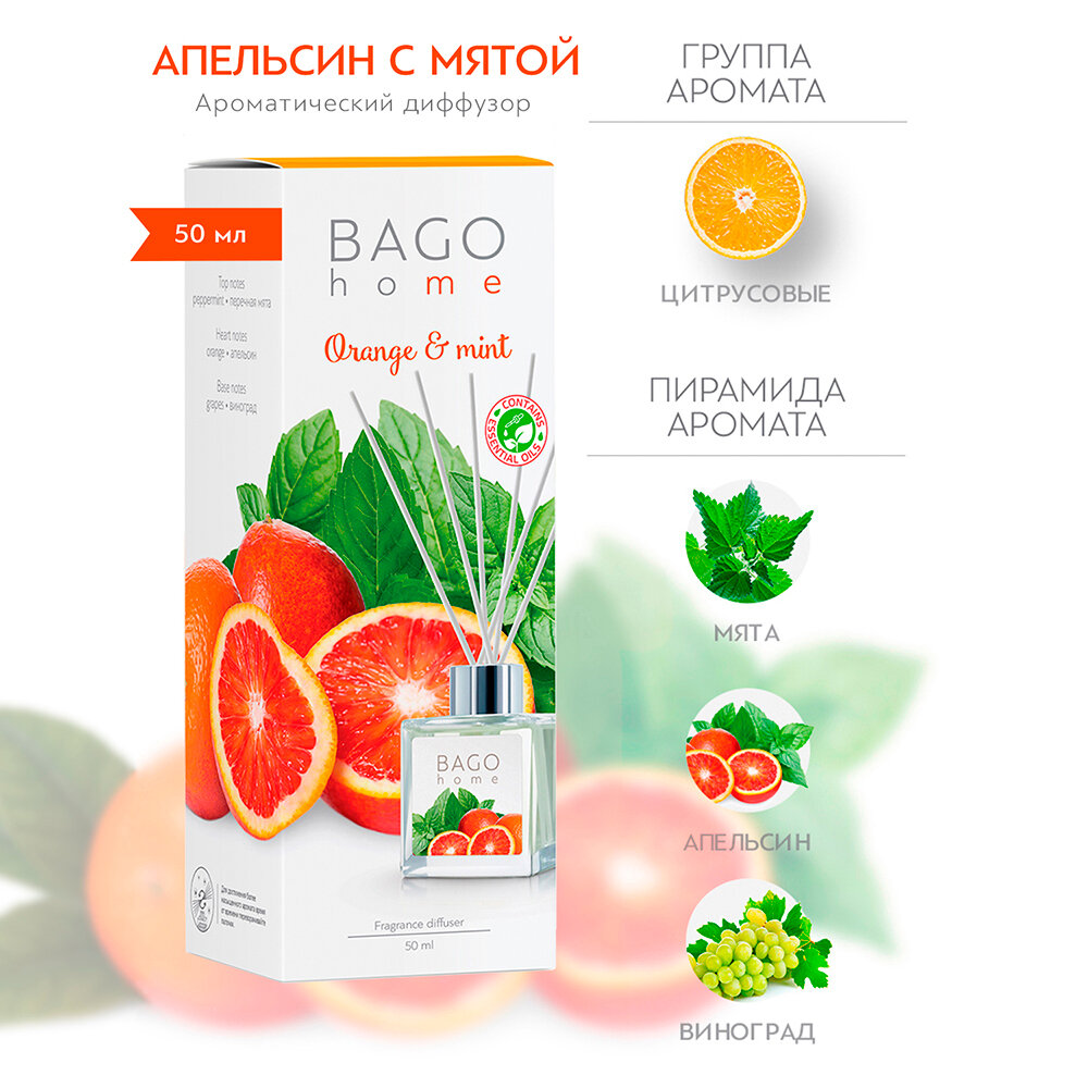Диффузор ароматический BAGO home Апельсин и мята. Объём 50 мл.