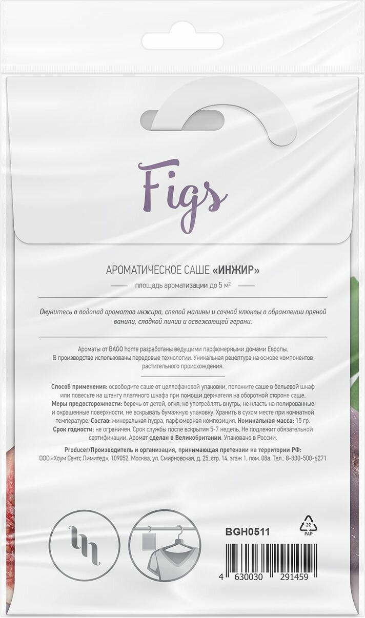 Ароматическое саше для дома и белья Инжир от BAGO home (Баго Хоум) - многогранный аромат инжира от летнего и травянистого до тонкого и горьковатого, как миндаль, волшебным образом объединяются со спелой малиной и сочной клюквой. Цветочная феерия из пряной ванили, сладкой лилии и свежести герани дополняет фруктово-ягодный букет. Верхние ноты: инжир Средние ноты: герань Нижние ноты: кремовая ваниль. Ароматическое саше используют для ароматизации помещений и салонов автомобилей; создания уютной атмосферы в доме, на рабочем месте или в зоне релаксации; благотворного воздействия на настроение и самочувствие людей; стимуляции работоспособности; борьбы с депрессией, вспыльчивостью, стрессовыми состояниями, бессонницей; придания приятного аромата хранящейся в шкафу одежде и постельным принадлежностям. Способ применения: Освободите ароматическое саше от целлофановой упаковки, не вскрывая бумажный конверт. Саше можно поместить в гардеробную комнату, в ящики для белья и платяные шкафы (используя при этой бумажный крючок в упаковке), в багаж или сумку, в салон автомобиля и под подушку. Не кладите саше на полированные и окрашенные поверхности. Внимание: Ознакомьтесь со сроком службы, временем работы и мерами предосторожности продукта. Храните в недоступном для детей месте. Держите вдали от огня. Срок годности: Не ограничен. Срок службы после вскрытия 5-7 недель.