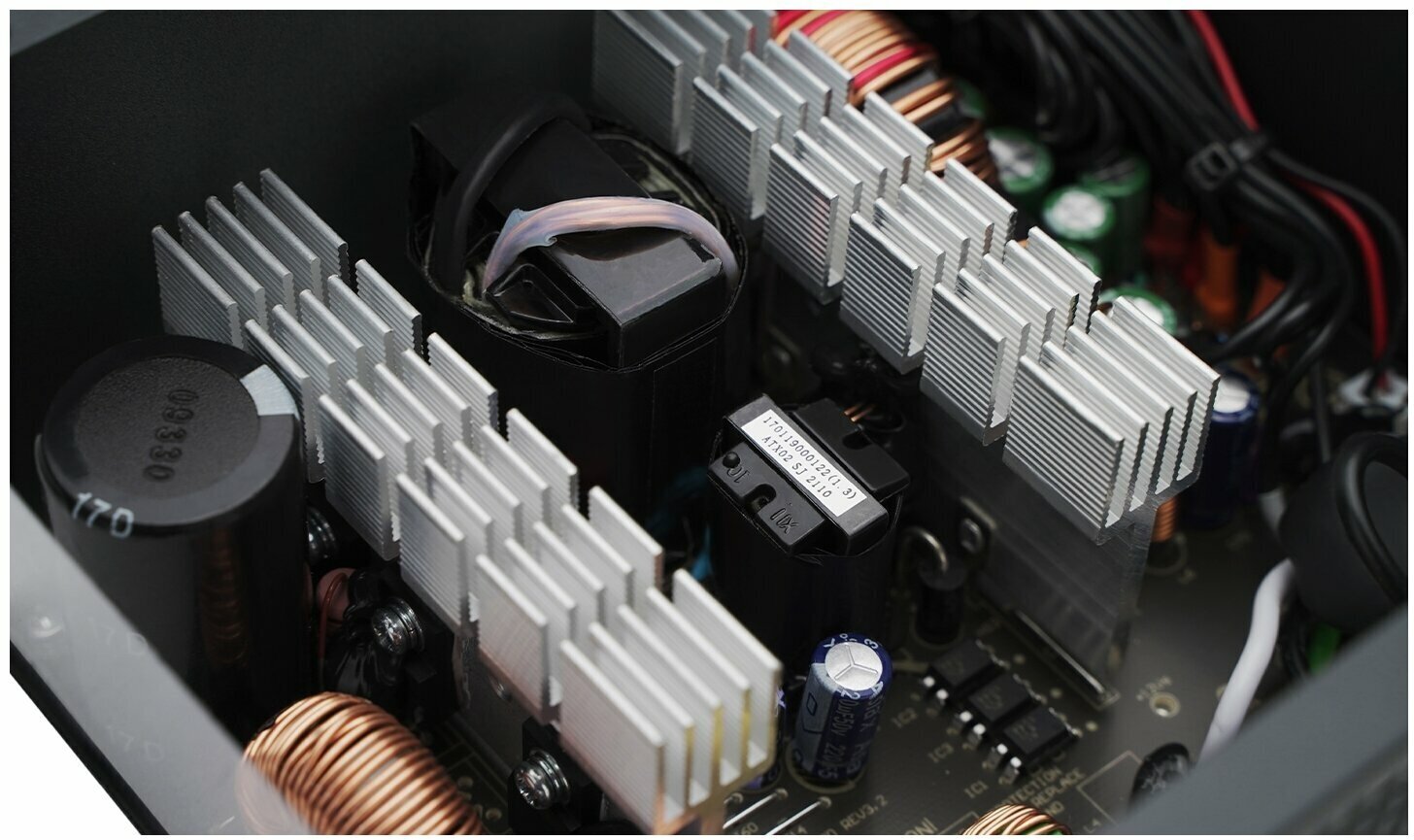 Блок обеспечивает стабильное напряжение по всем линиям. Здесь установлен тихий вентилятор на гидравлическом подшипнике. Чёрные кабели незаметны и гибки, ими легко манипулировать при укладке проводов собираемого компьютера, и они занимают в системе меньше места. Защита от перегрузки по току, по напряжению и от короткого замыкания. КПД 85% при половинной нкгрузке.