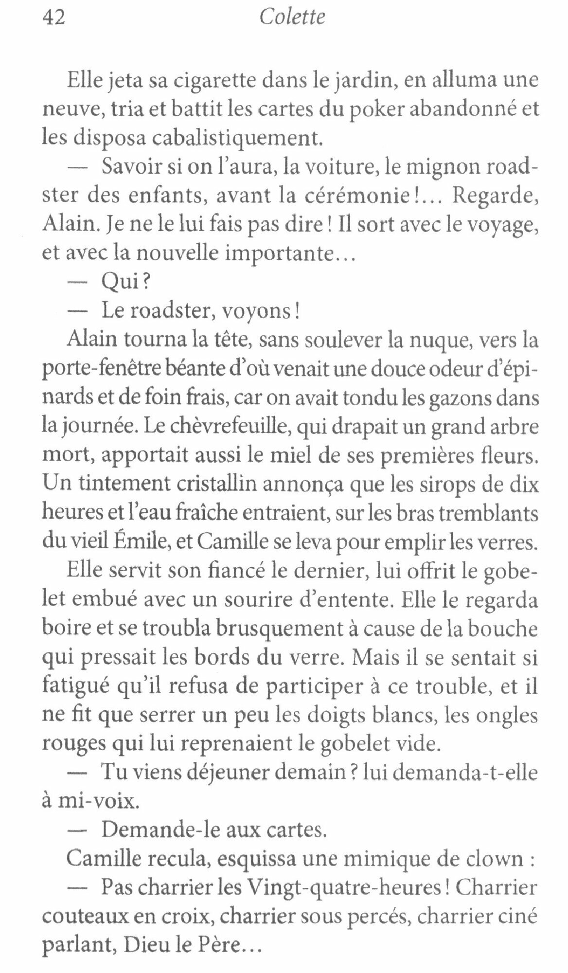 Lorsque debute leur vie commune, Alain et Camille sont deux amis d’enfance que tout en apparence rapproche. Mais leurs secretes reveries les divisent. « Mon mariage, reconnait Alain, contente tout le monde et Camille, et il y a des moments ou il me contente aussi, mais… » Ce qu’Alain aime en Camille, c’est une beaute idealisee, faite d’immobilite et de silence. Aussi est-il deconcerte par son exuberance. Comme l’arrivee d’une saison nouvelle, la decouverte de leur intime division le met a la merci d’autres reves. Et c’est alors que le drame se noue. La chatte Saha sera desormais pour Alain la chimere sublime qui domine sa vie et pour Camille la rivale detestee contre laquelle aucun procede n’est trop brutal. Avec une maitrise et une sobriete sans egales, Colette a compose, en suivant les regles de l’art classique, une veritable tragedie d’amour a trois personnages. Couverture dessinee par Leonor Fini.