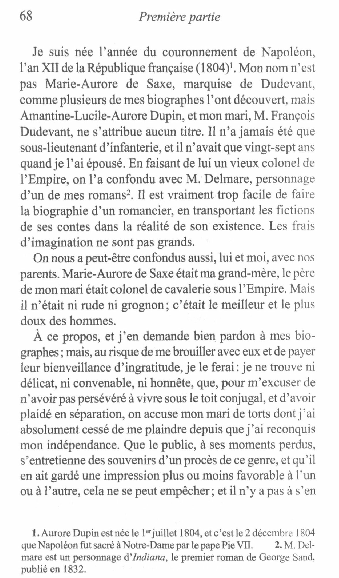Lorsqu’en 1847 George Sand, qui a deja fait paraitre ses plus grands romans, entreprend a quarante-trois ans son Histoire de ma vie, elle definit ainsi son futur livre : « C’est une serie de souvenirs, de professions de foi et de meditations dans un cadre dont les details auront quelque poesie et beaucoup de simplicite. Ce ne sera pourtant pas toute ma vie que je revelerai. » Son modele n’est pas Rousseau, ni d’ailleurs les Memoires d’outre-tombe qui vont commencer a etre publies et ou elle voit trop de pose et de drape. Son ambition n’est pas d’inscrire sa vie dans le mouvement de l’Histoire, mais d’offrir le recit d’une existence de femme et d’ecrivain qui cotoie rapidement Balzac et Sainte-Beuve, l’abbe de Lamennais et le socialiste Pierre Leroux – et bien sur Musset et Chopin. Le lecteur trouvera ici le tiers, environ, de cette ?uvre immense dont les vingt volumes commencent a paraitre en 1854 et qui occupe une place essentielle dans l’histoire de l’autobiographie. Car si d’autres femmes, avant Sand, ont ecrit des memoires, la singularite de son Histoire de ma vie est qu’on y decouvre pour la premiere fois le recit de formation d’une jeune fille qui a voulu etre artiste – mais un recit sans egotisme parce que au miroir de sa propre existence elle desire que se retrouvent tous les autres enfants du siecle : « Ecoutez ;