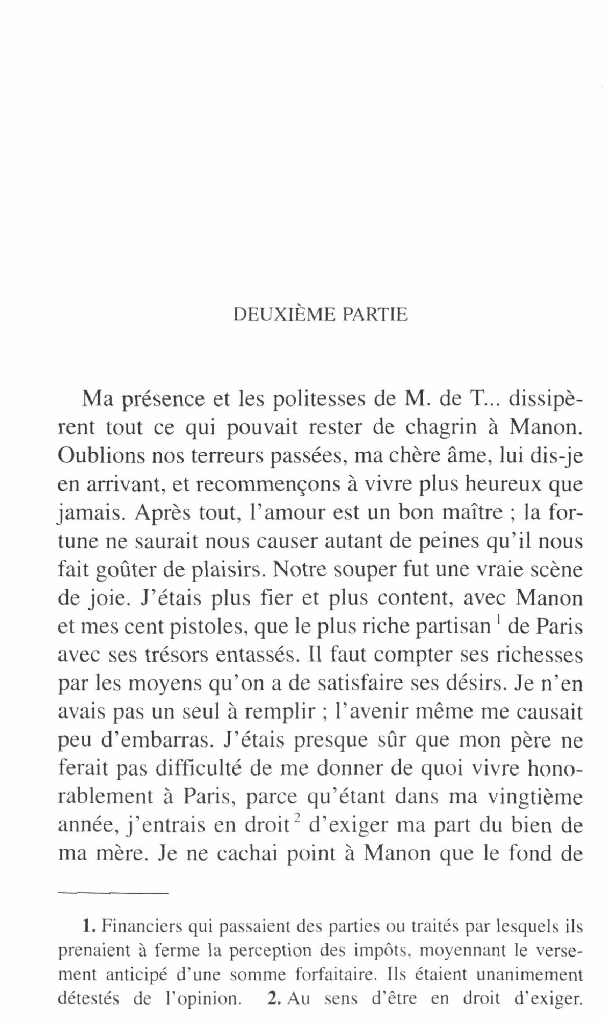 Alors qu'a dix-sept ans, il s'apprete a quitter Amiens ou il acheve ses etudes de philosophie, des Grieux voit arriver le coche d'Arras. Une jeune fille en descend, si charmante qu'il s'avance vers elle pour l'interroger : ses parents l'envoient pour etre religieuse, et elle sait qu'elle va etre malheureuse. Decide a l'arracher a la tyrannie de ses parents, il la loge dans une hotellerie dont le maitre lui est devoue et le lendemain, a la pointe du jour, tous les deux partent pour Paris. Lorsqu'elle s'est tragiquement achevee, des Grieux fait le recit de sa tumultueuse liaison avec Manon au marquis de Renoncour qui la rapporte dans ses Memoires que Prevost fait paraitre au mois de mai 1731. C'est ainsi la voix meme du chevalier que nous entendons, c'est l'emotion qu'il eprouve a raconter et a revivre ce qu'il a vecu qui nous touche - et sa parole fait entendre des accents si vrais que l'on a pu croire que Manon et des Grieux avaient veritablement existe, ou que l'abbe Prevost transposait un moment de sa propre vie. Mais le realisme poignant de ce recit traverse de souffrances, de cette histoire ou le plaisir se vit, s'achete, et conduit a la mort, n'est redevable qu'a l'art eblouissant de l'auteur. Professeur emerite a l'Universite de Tours et ancien membre de l'Institut Universitaire de France, Jean Goulemot a recemment publie Adieu les philosophes. Que reste-t-il des Lumieres? (Seuil, 2001). Il a egalement procure au Livre de Poche une edition du Paradoxe sur le comedien de Diderot et de La Nouvelle Heloise de Rousseau.