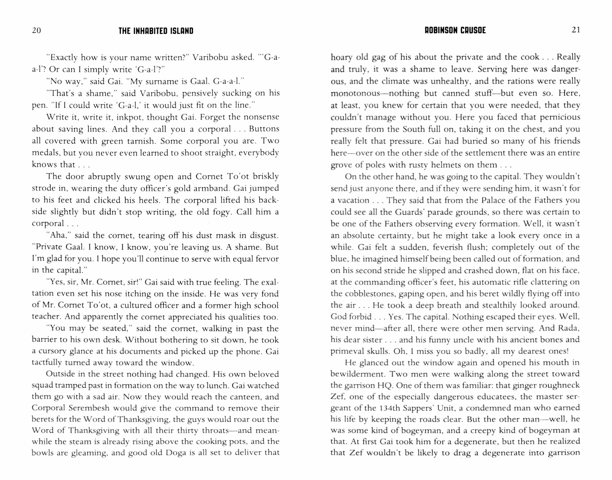 When Maxim Kammerer, a young space explorer from twenty-second-century Earth, crash-lands on an uncharted world, he thinks of himself as a latter-day Robinson Crusoe. Eager to establish first contact with the planet's humanlike inhabitants, he finds himself increasingly entangled in their primitive way of life. After his experiences in their nightmarish military, criminal justice, and mental health systems, Maxim begins to realize that his sojourn on this radioactive and war-scarred world will not be a walk in the park.
