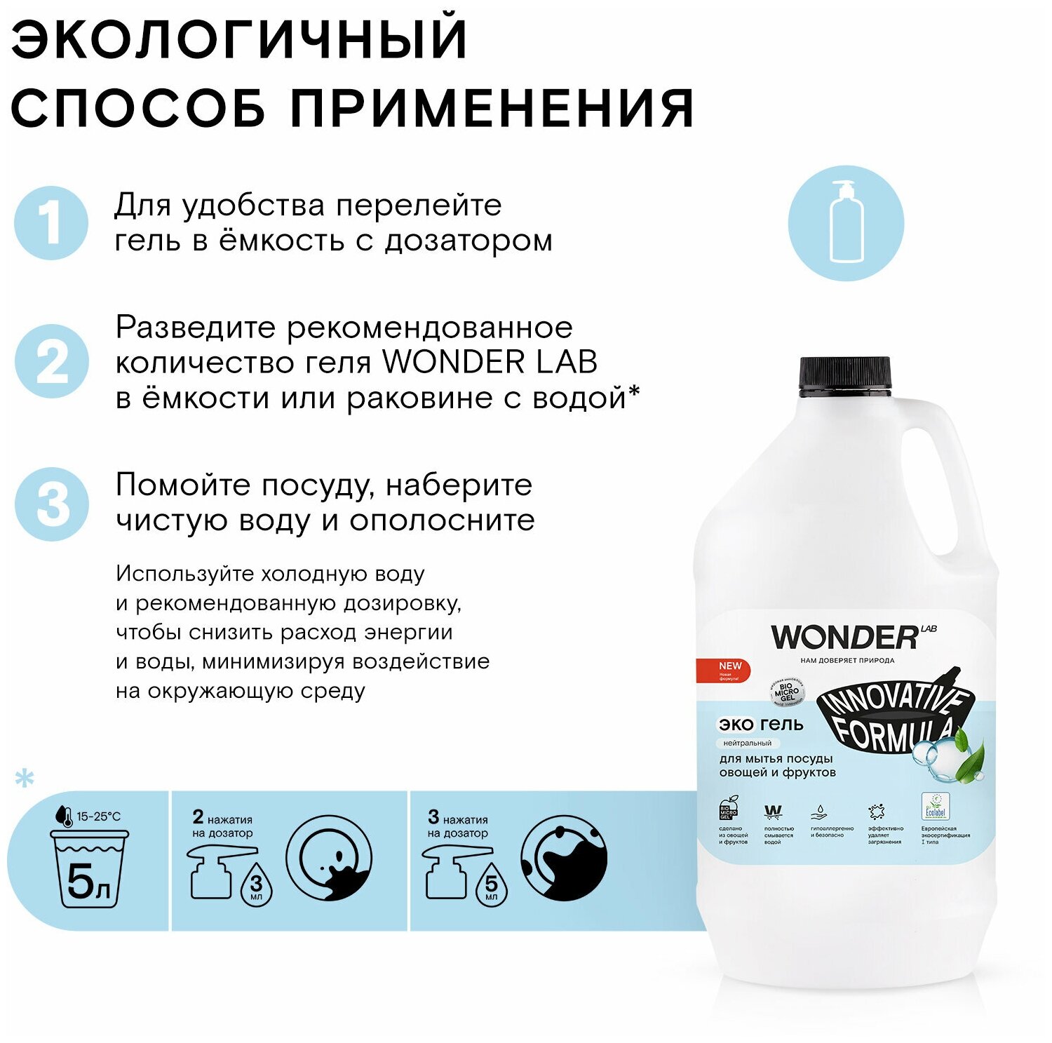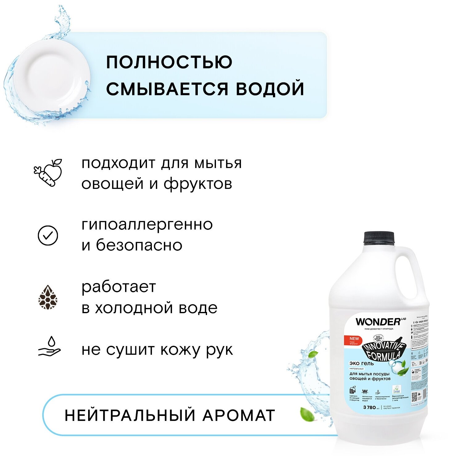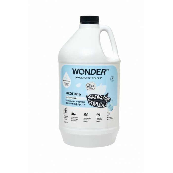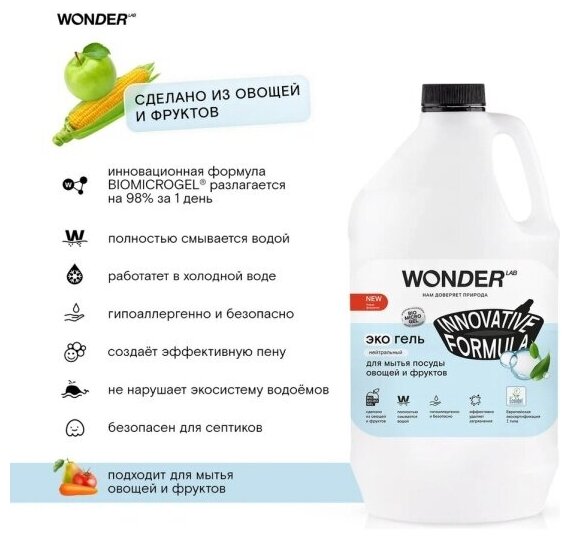 Средство для мытья посуды WONDER LAB обладает нейтральным ароматом и подходит для людей чувствительных к лишним запахам. Гель для посуды эффективен в любых условиях, работая и в холодной, и в горячей воде. Благодаря гелеобразной текстуре, средство экономично расходуется и отлично пенится. Средство полностью смывается в считанные секунды, удаляет жир, остатки пищи, неприятные запахи от рыбы и других продуктов. Не оставляет после себя разводов на посуде и придает её блеск. Гель подходит для мытья овощей и фруктов, смывая поверхностные консерванты и внешние загрязнения. Средство для посуды WONDER LAB - максимально экологичный продукт на всех этапах жизненного цикла, что подтверждает европейский экосертификат 1-го типа Ecolabel.Средство для мытья посуды не раздражает даже самую нежную и чувствительную кожу, т. к. является PH нейтральным. Гипоаллергенность подтверждена по результатам клинических исследований Медицинского научно-диагностического центра ООО "НПЦ "КосмоПродТест" (клиническое исследование № 074113 от 12.07.2019). Средство для посуды WONDER LAB - максимально экологичный продукт на всех этапах жизненного цикла, что подтверждает европейский экосертификат 1-го типа Ecolabel.Экосредства WONDER LAB созданы на основе инновационного компонента Biomicrogel®, который сделан из овощей и фруктов. Средства WONDER LAB не вредят окружающей среде, не содержат опасных компонентов и разлагаются на 98% за 1 день. Гель для посуды WONDER LAB подходит для септиков.